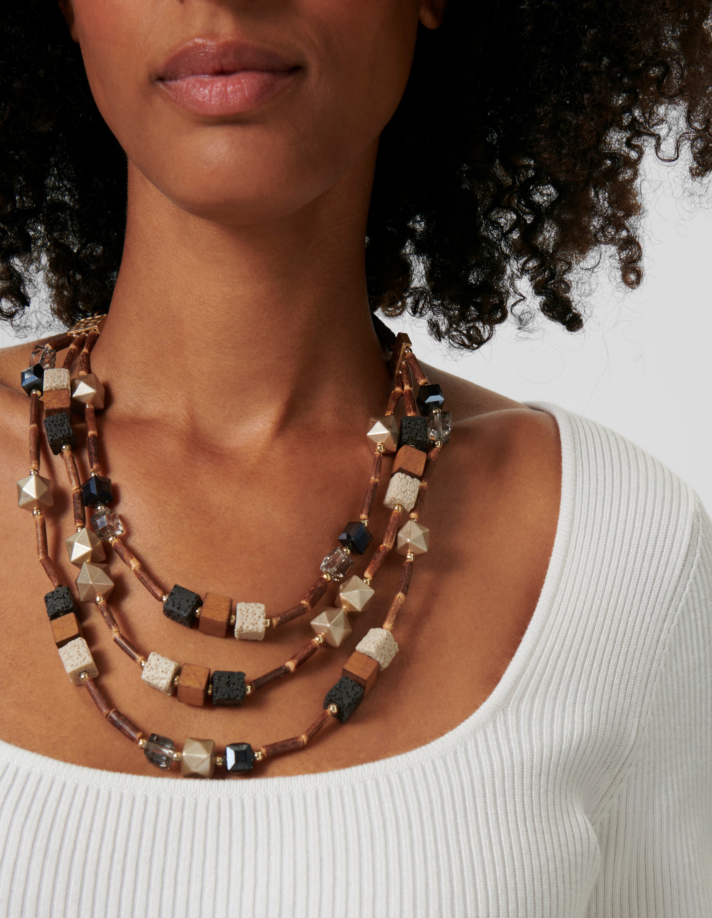 Meerdere keren omgeslagen halsketting met sierelementen van hout en kunsthars.