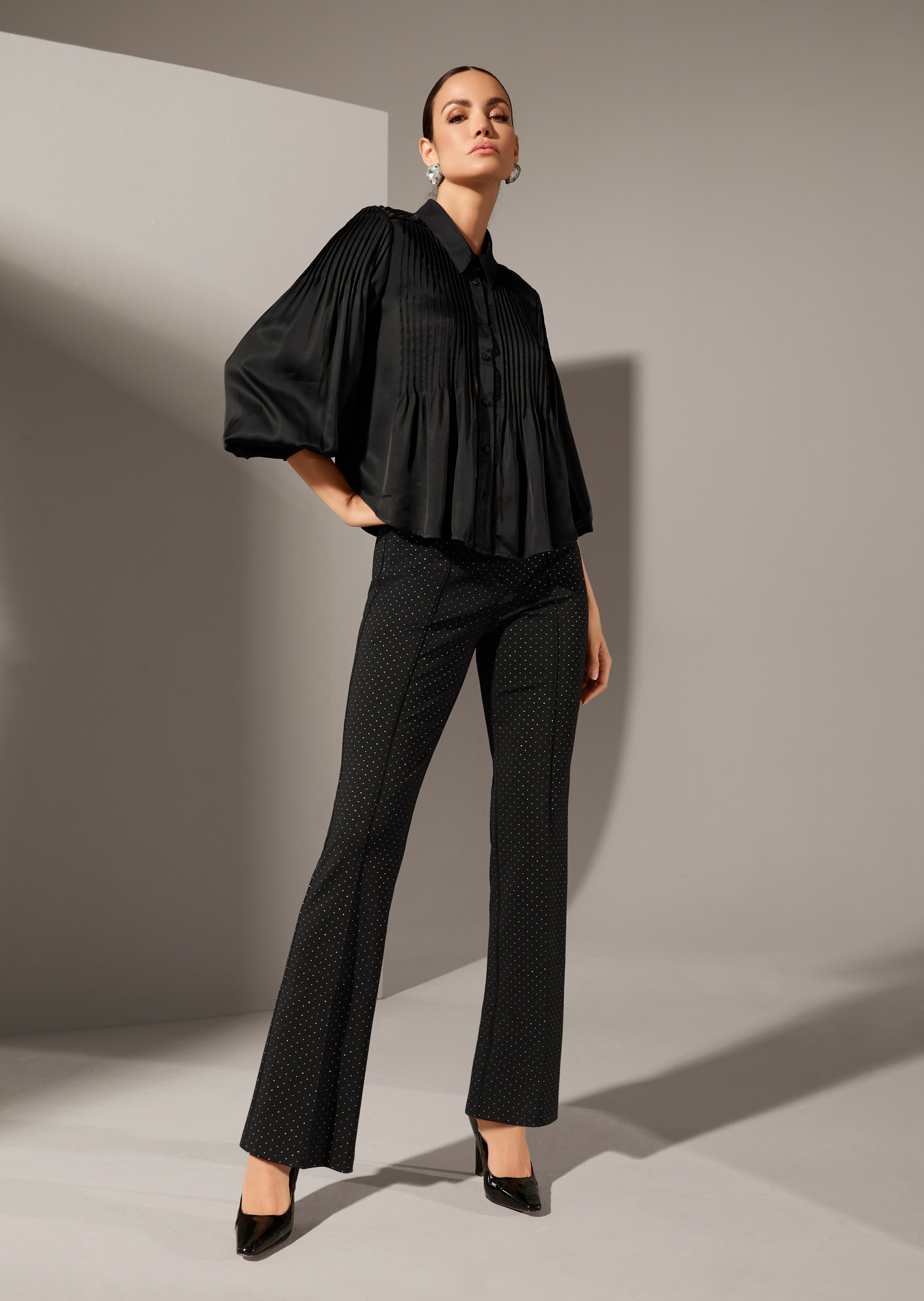Comfortabele jersey in een modieus slanke pasvorm, met een subtiele, fijn glinsterende print rondom. Zit heerlijk en is gemakkelijk aan te trekken dankzij de elastische tailleband. Doorgestikte biezen aan de voorkant en gestreken vouwen aan de achterkant voor een verzorgde touch.