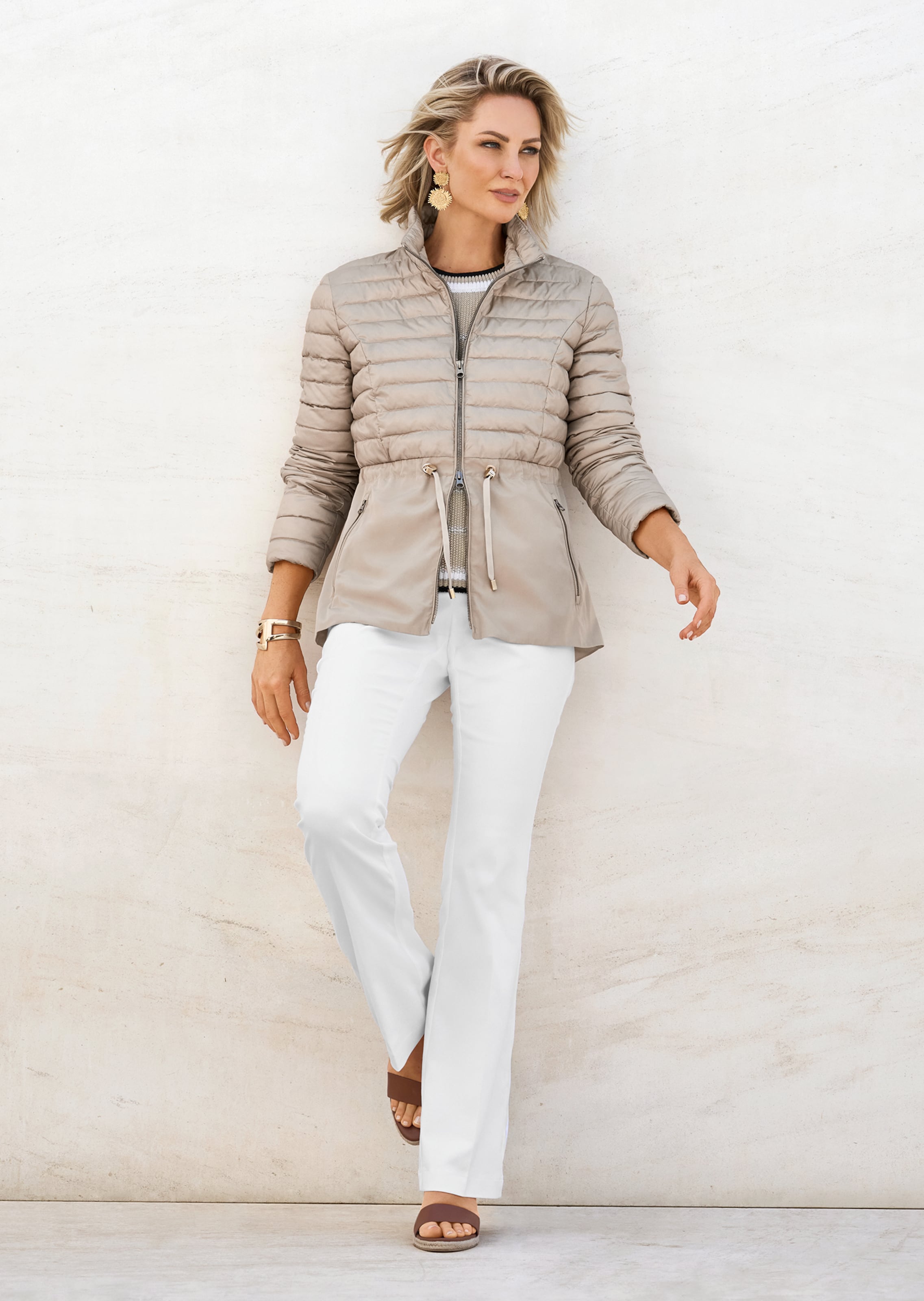 Aan de bovenkant en aan de mouwen van lichtjes gewatteerd, zomers doorgestikte stof. Bovenkant met opstaande kraag, binnenzakje en rits aan de voorkant. Glad afgewerkte onderkant in een mooi in model blijvende shape-memory-kwaliteit met een variabel tunneltje en zakken met rits.