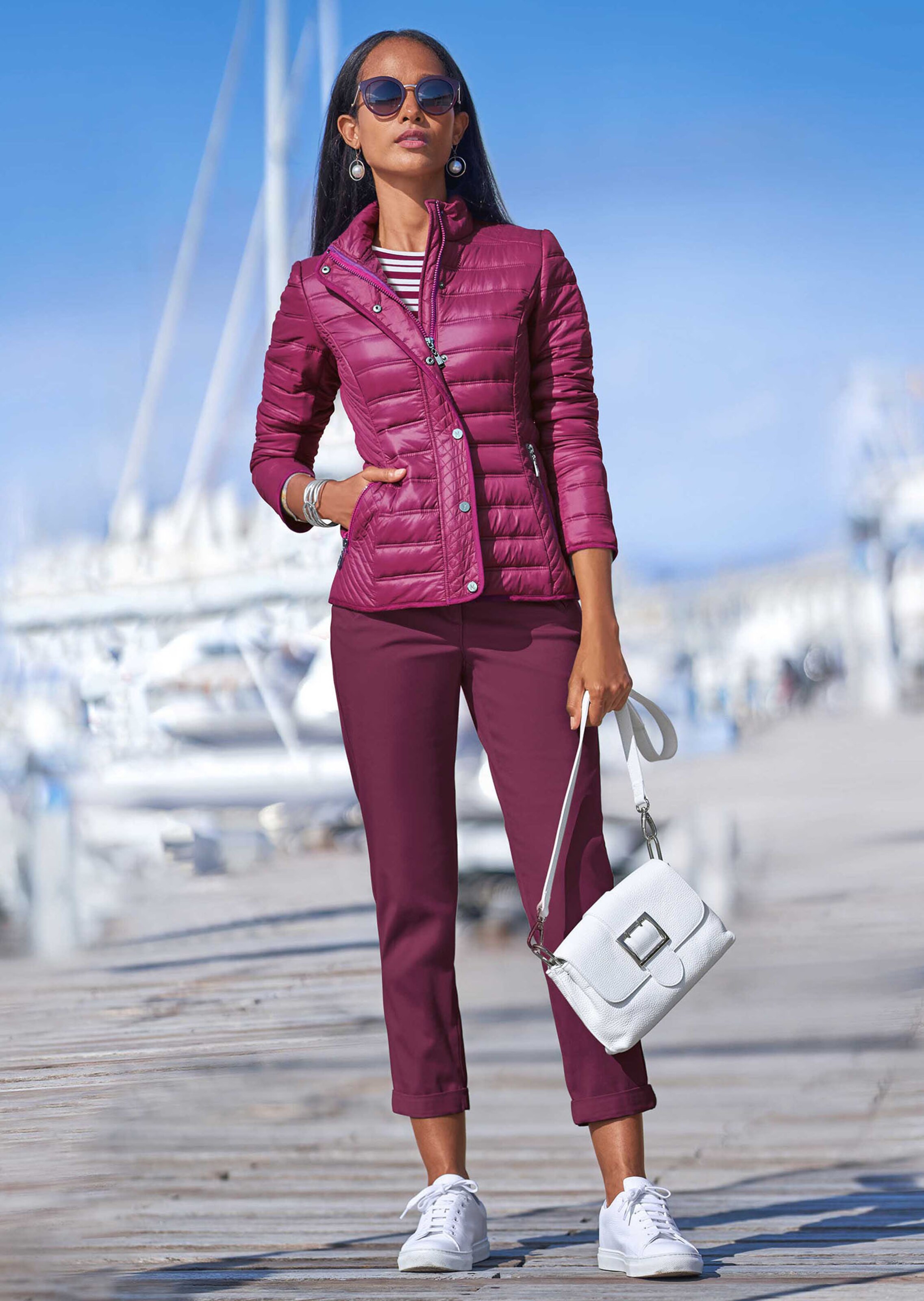 Licht gewatteerd. Met ronde hals, 2-weg-rits en lange mouwen met manchet en drukknoop. Capuchon en zoom met tunnelkoordje.