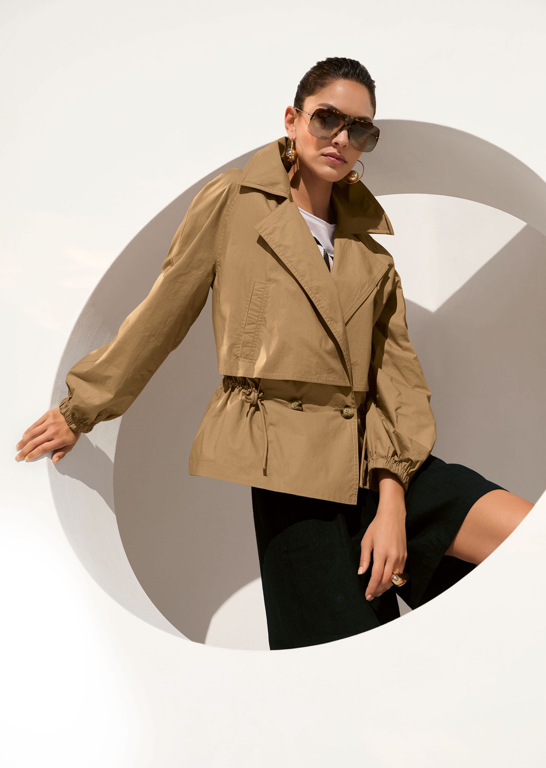 Zacht natuurlijk garen in een vormvaste shape-memory-afwerking met een reverskraag en knoopsluiting. Voorkant met geïntegreerde paspelzakken. Raglanmouwen met elastische manchetten. Tunnelkoordje in de taille.