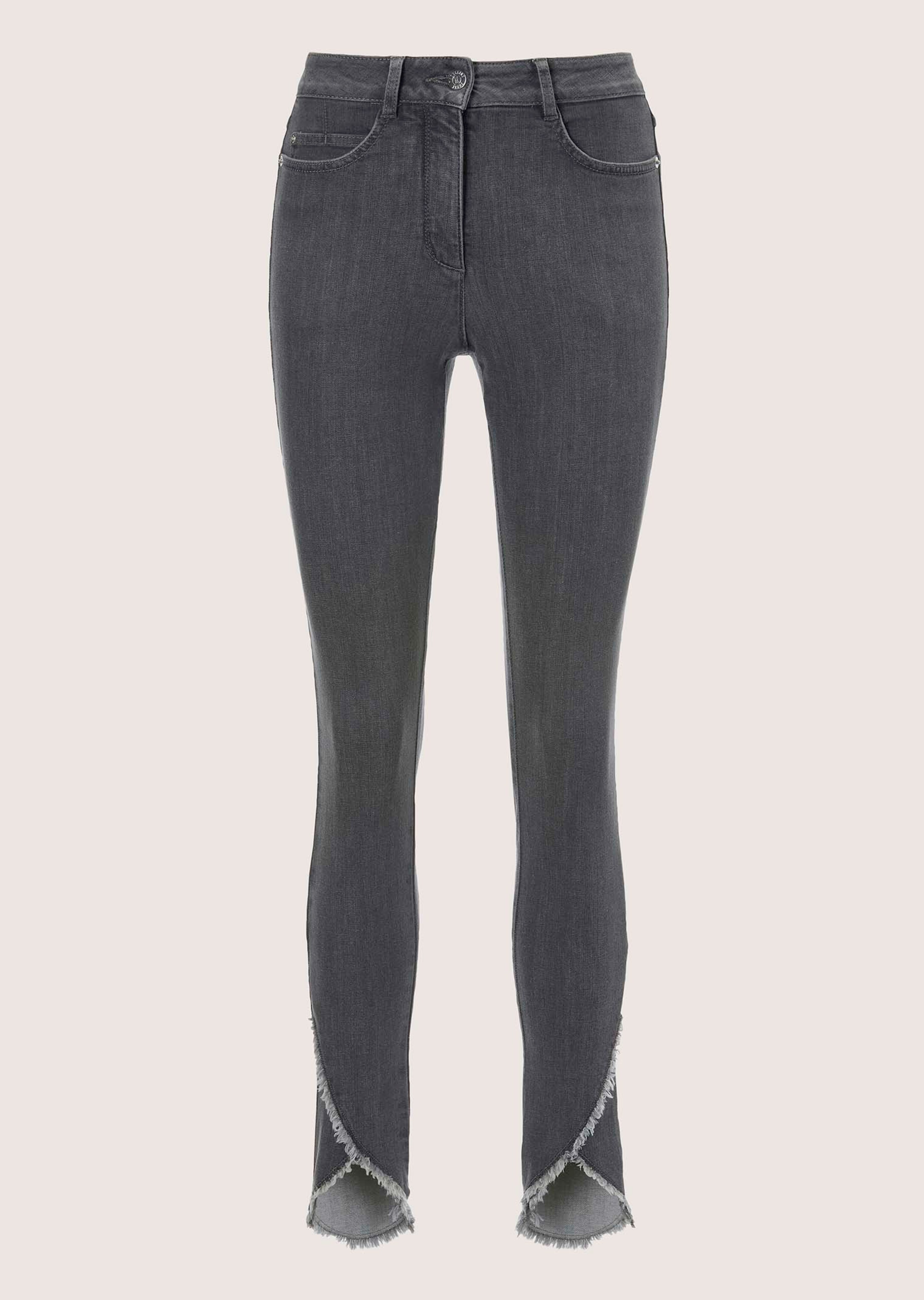 Smal gesneden 5-pocket-style met vormgevende tailleband, riemlusjes, vormgevende pas aan de achterkant en trendy franjezoom.