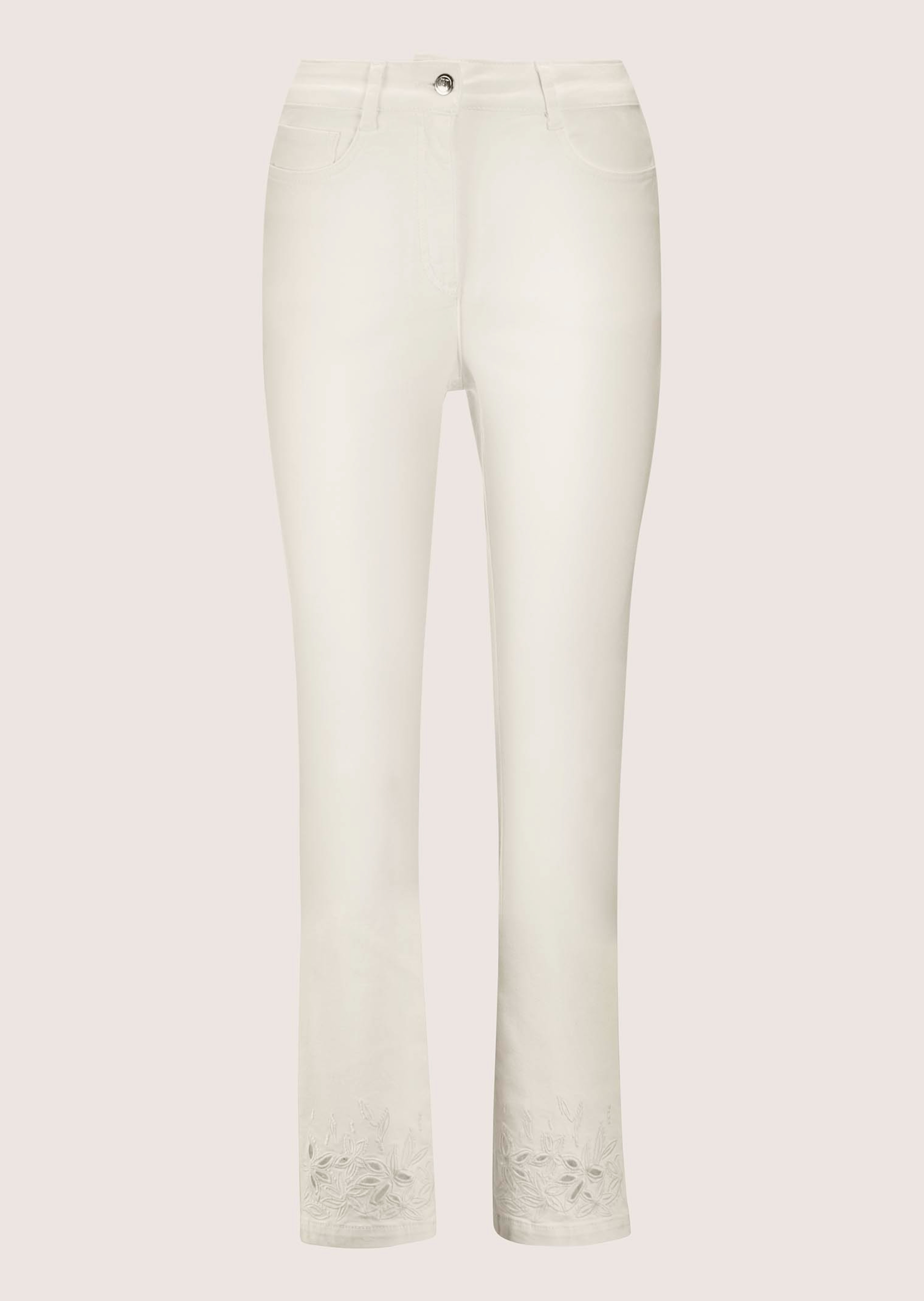 Van heerlijk comfortabele stretchkatoen in een lichtjes uitlopend, ietwat korter 5-pocket-model met gaatjesborduursel aan de voorkant. Vormgevende tailleband met riemlusjes.