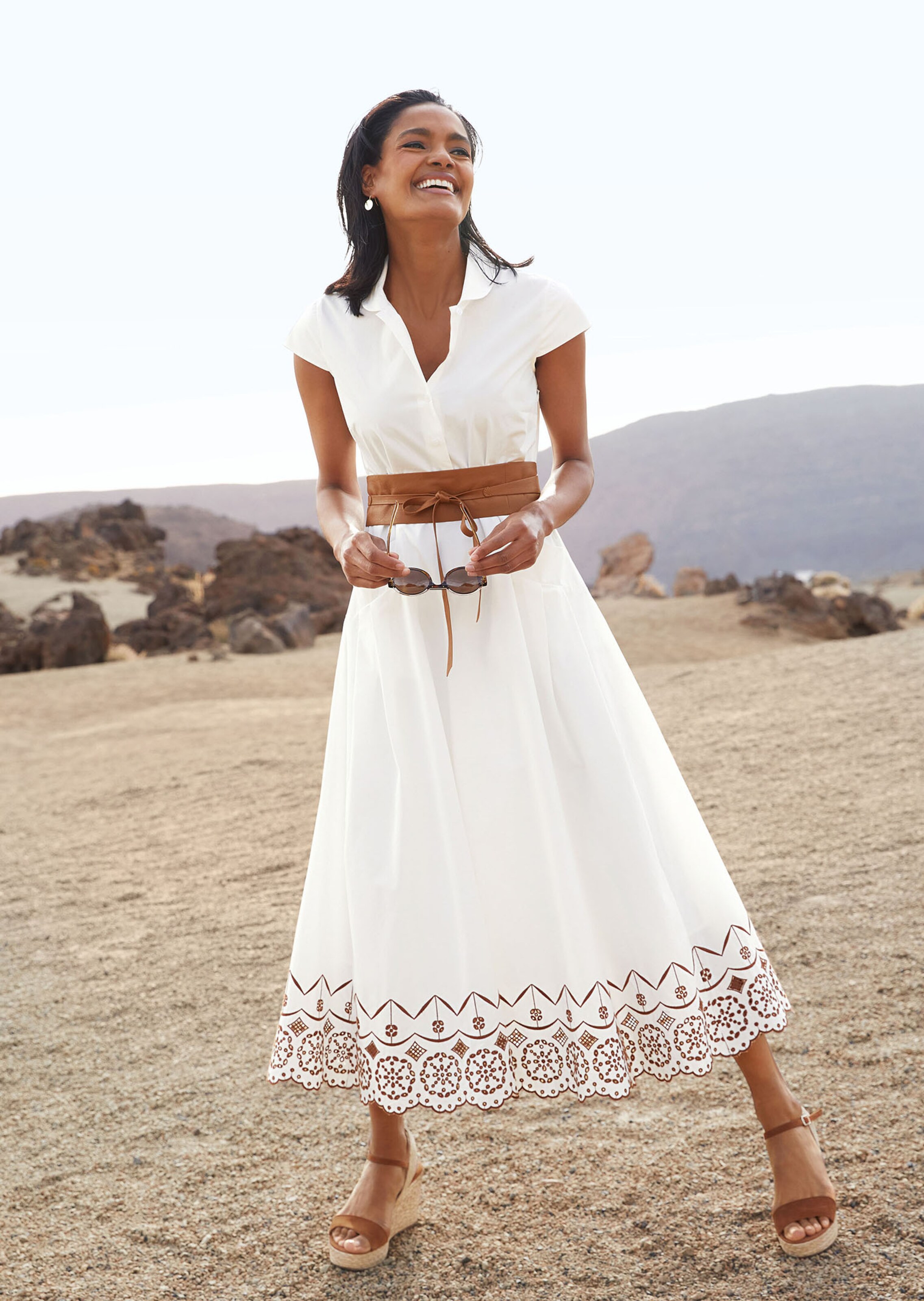 Van huidvriendelijk, aangenaam licht natuurgaren. Lijfje met klein kraagje, korte kapmouwtjes en taillelange knopenlijst. Striklint in de taille. Zwierige plooirok met mooi contrasterend gaatjesstiksel aan de zoom en steekzakken, vanwaar naar de zoom toe lange plooien opspringen. Ritssluiting in de naad opzij.