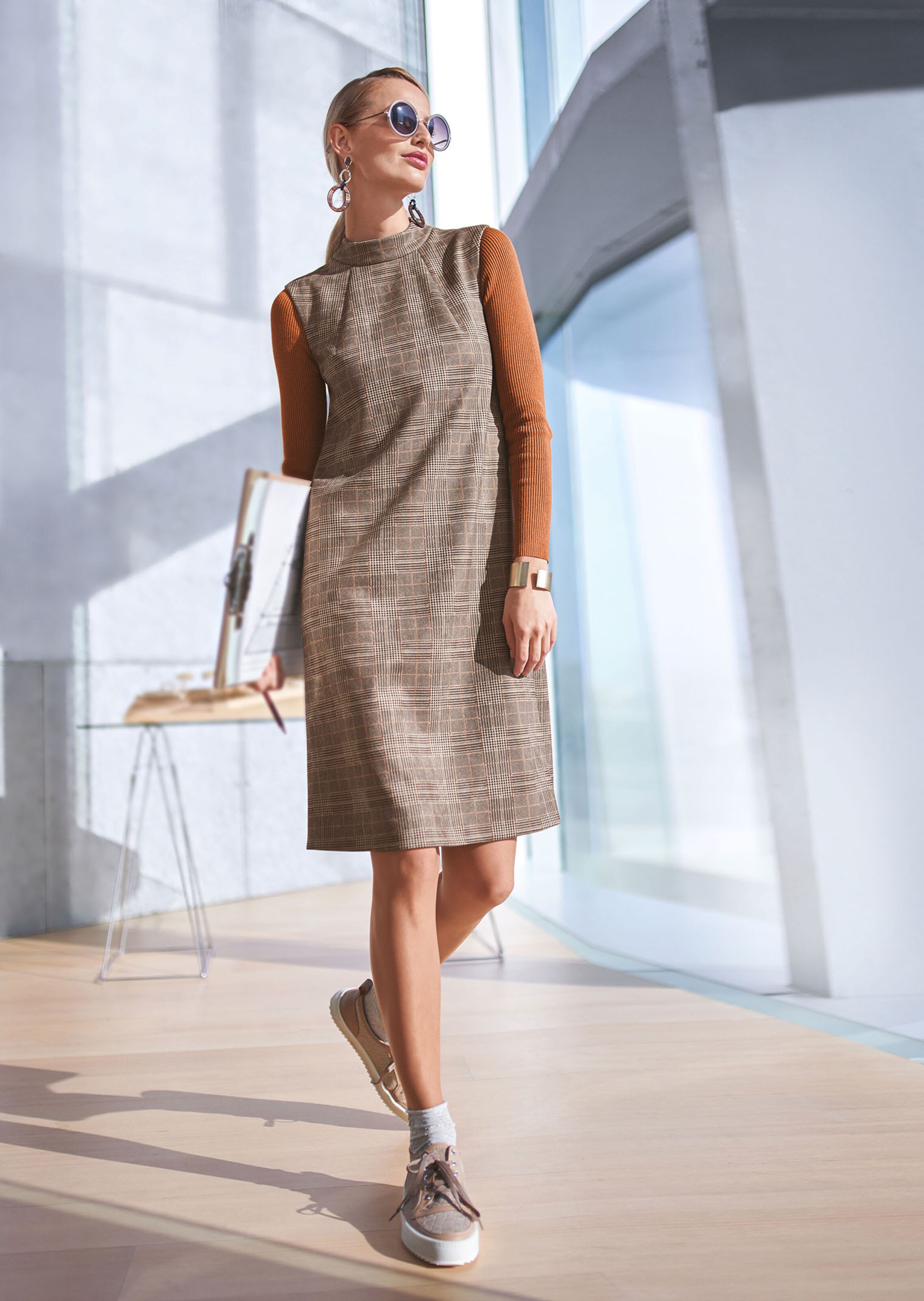 In nonchalante A-lijn met aantrekkelijk ruitdessin. Aangenaam zacht model zonder mouwen, met opstaand kraagje en steekzakken.