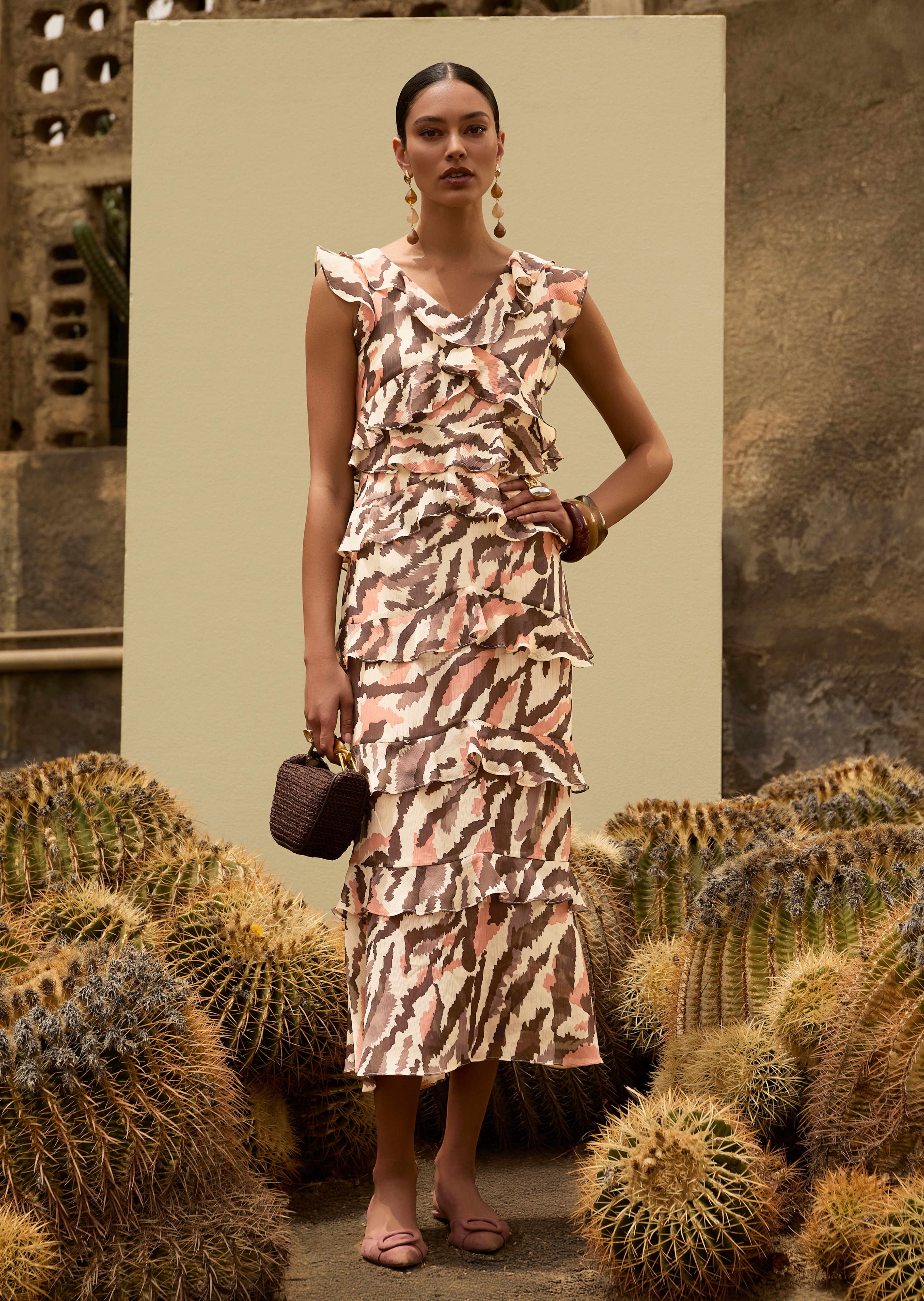 Een romantische en speelse jurk die in de smaak zal vallen! Soepele chiffon met een unieke abstracte dierenprint, afgewerkt met volants rondom. Mouwloos model met V-hals en ritssluiting achter.