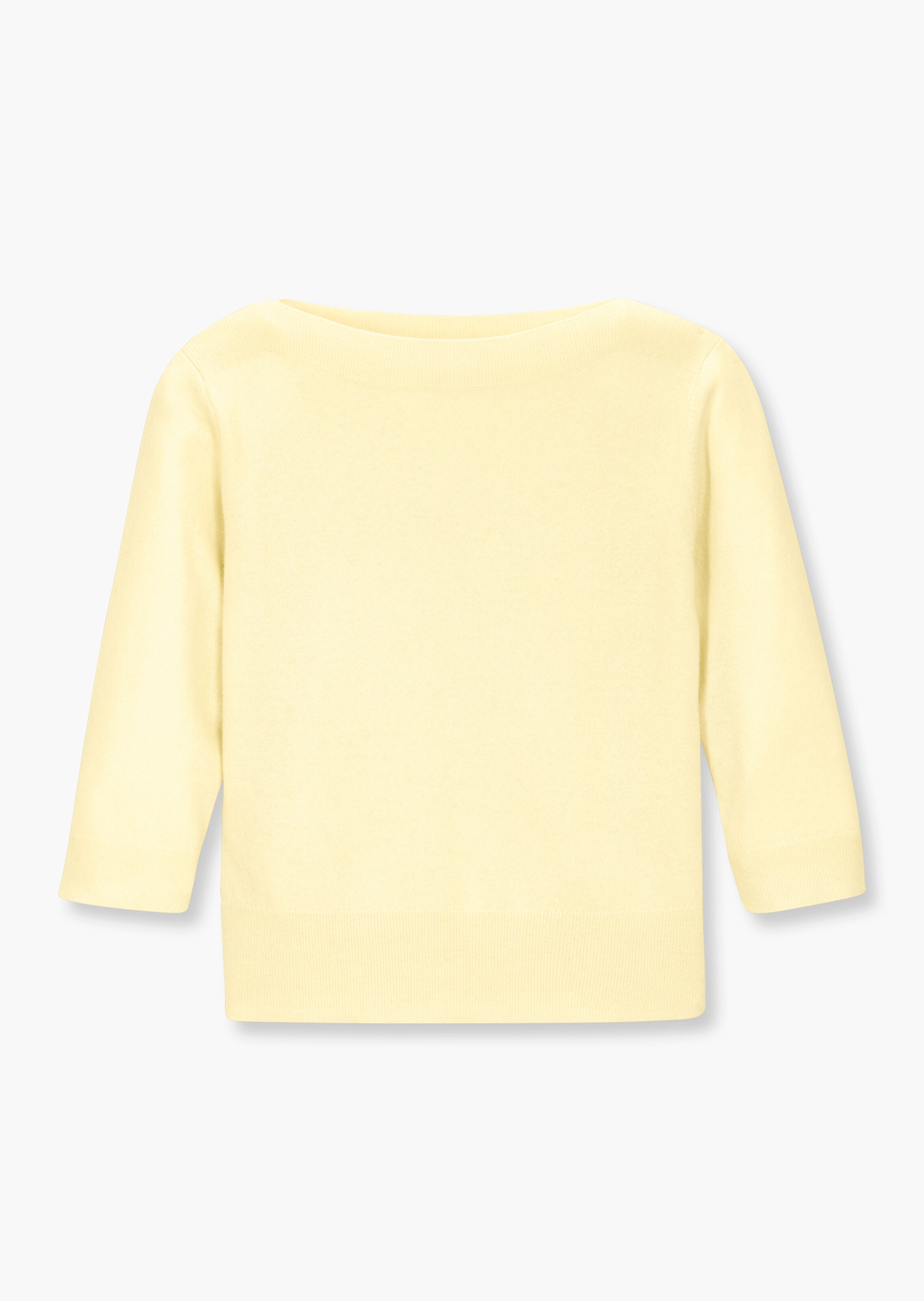Puur qua stijl; luxe qua karakter. Vrouwelijke, gebreide trui met boothals, aangebreide schouders, 3/4-mouwen en ribboordjes. Voor dit artikel gebruiken we 100% premium kasjmierwol, die volgens The Good Cashmere Standard® by AbTF is gecertificeerd.