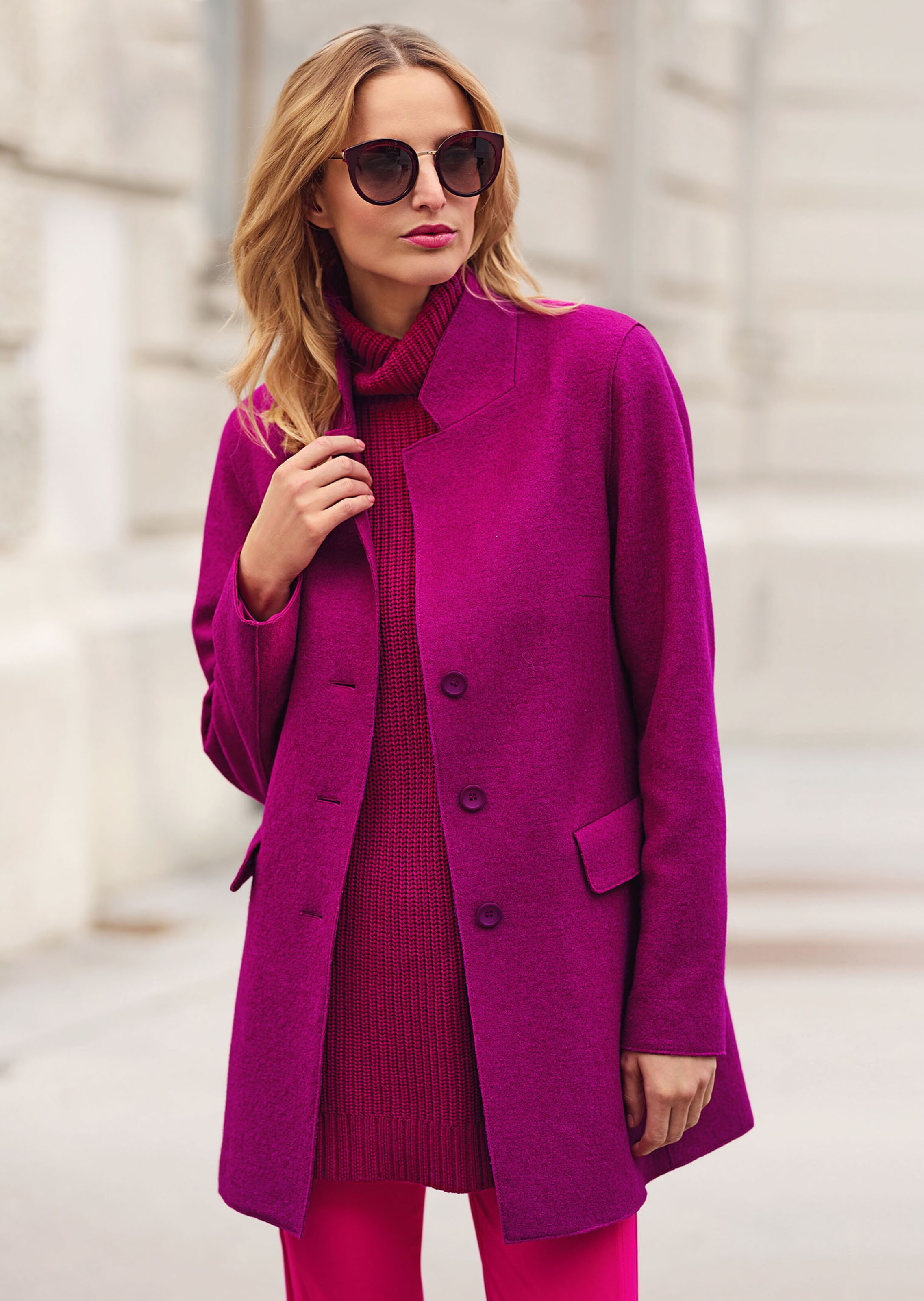Elegant en comfortabel, van een hoogwaardige wolmix met een subtiele structuur. Recht model met opstaande kraag, kleine revers, klepzakken, lange mouwen en knopenlijst.