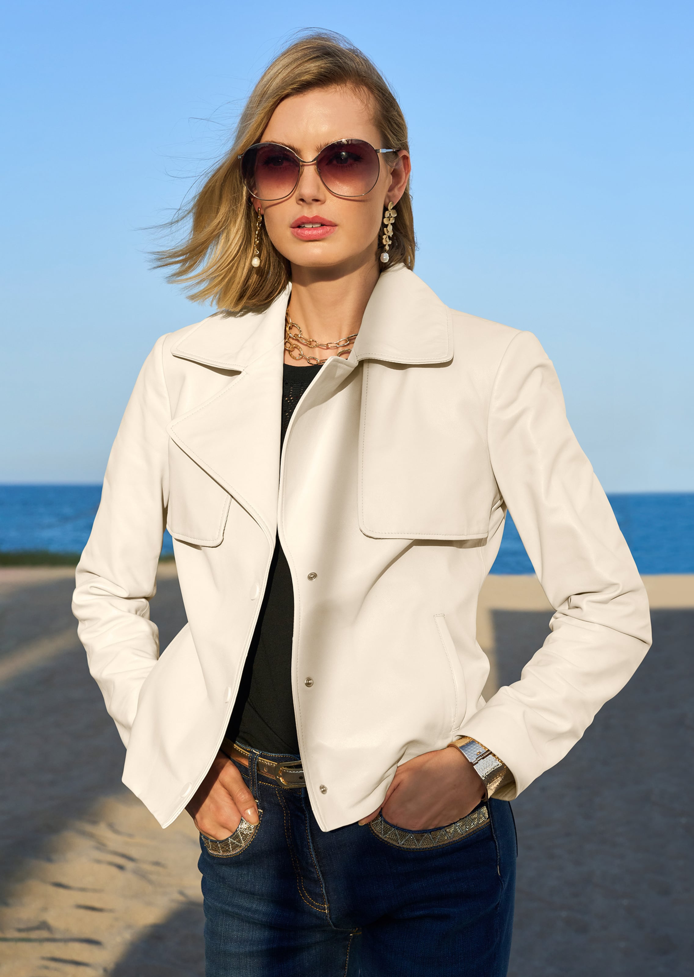 Van heerlijk zacht, luxe leer in populaire trenchlook. Modieus sportief, kort model met een wijd openstaande kraag, flappen aan de voorkant, ingewerkte zakken opzij en een binnenzakje.