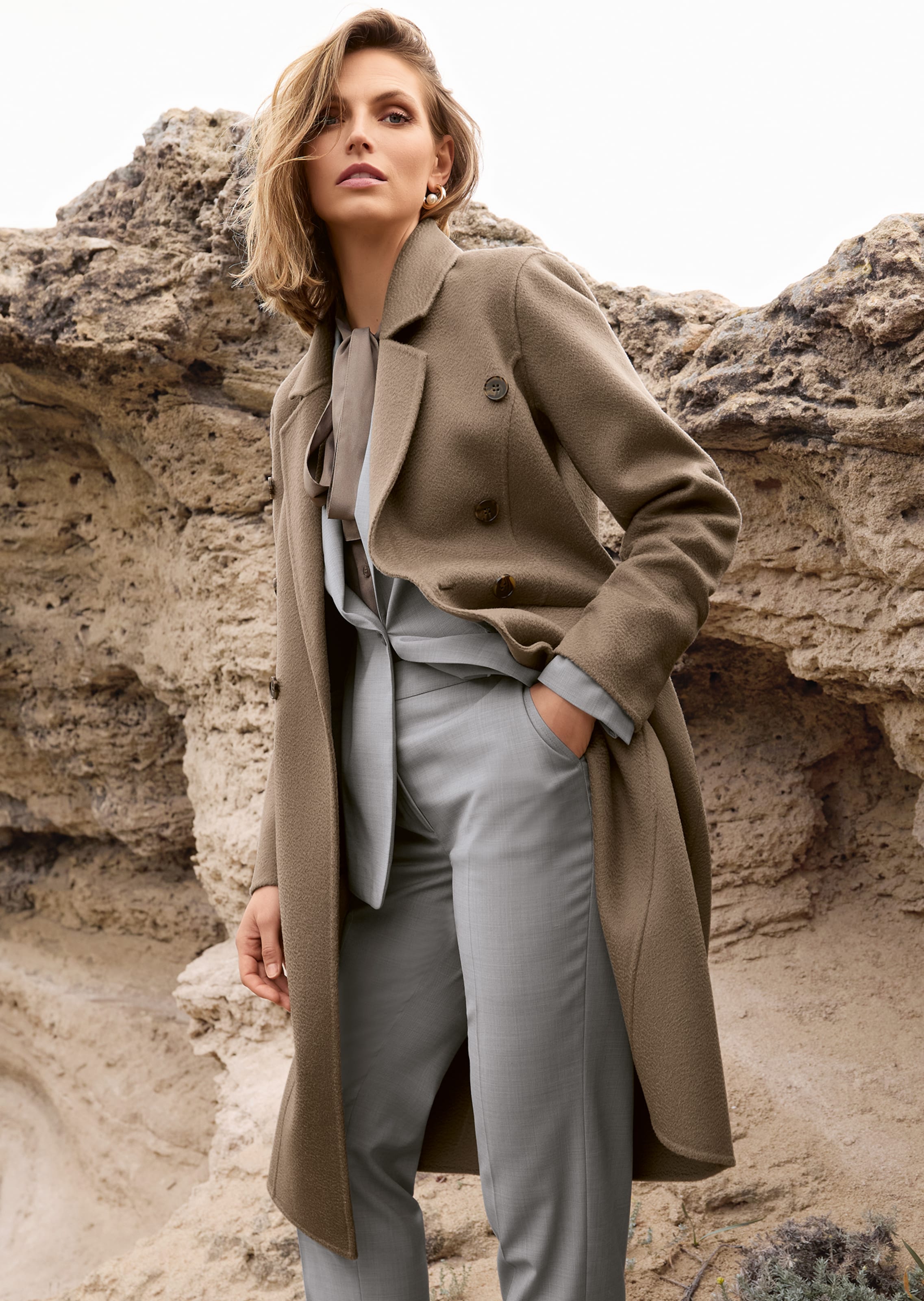 Hoogwaardige wollen mantel, aangenaam zacht qua textuur en in doubleface-finish. Vrouwelijk getailleerd model met twee rijen knopen, reverskraag en lange mouwen.