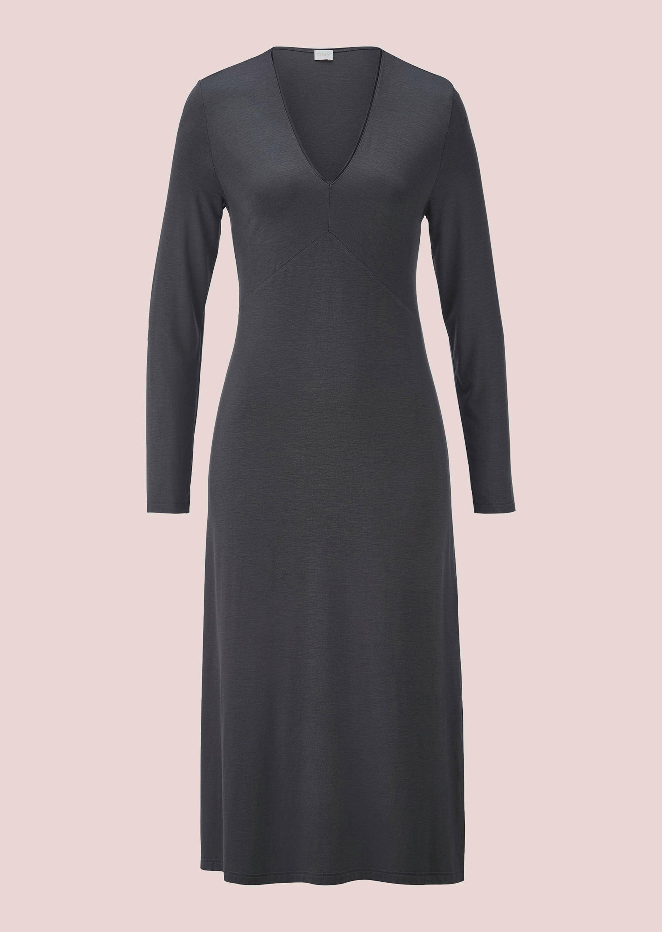 Dit lange nachthemd van MEY maakt indruk met de elegante stof van modal, die een zijdeachtige glans heeft en heerlijk zacht aanvoelt op de huid. Het getailleerde model met V-hals en satijnen biezen zorgt voor een elegant silhouet, terwijl de hoge zijsplitten bewegingsvrijheid en comfort bieden. Dankzij het elastaangehalte behoudt het kledingstuk zijn vorm, valt het soepel rond het figuur en voegt het een vleugje luxe toe aan uw slaapmomenten.