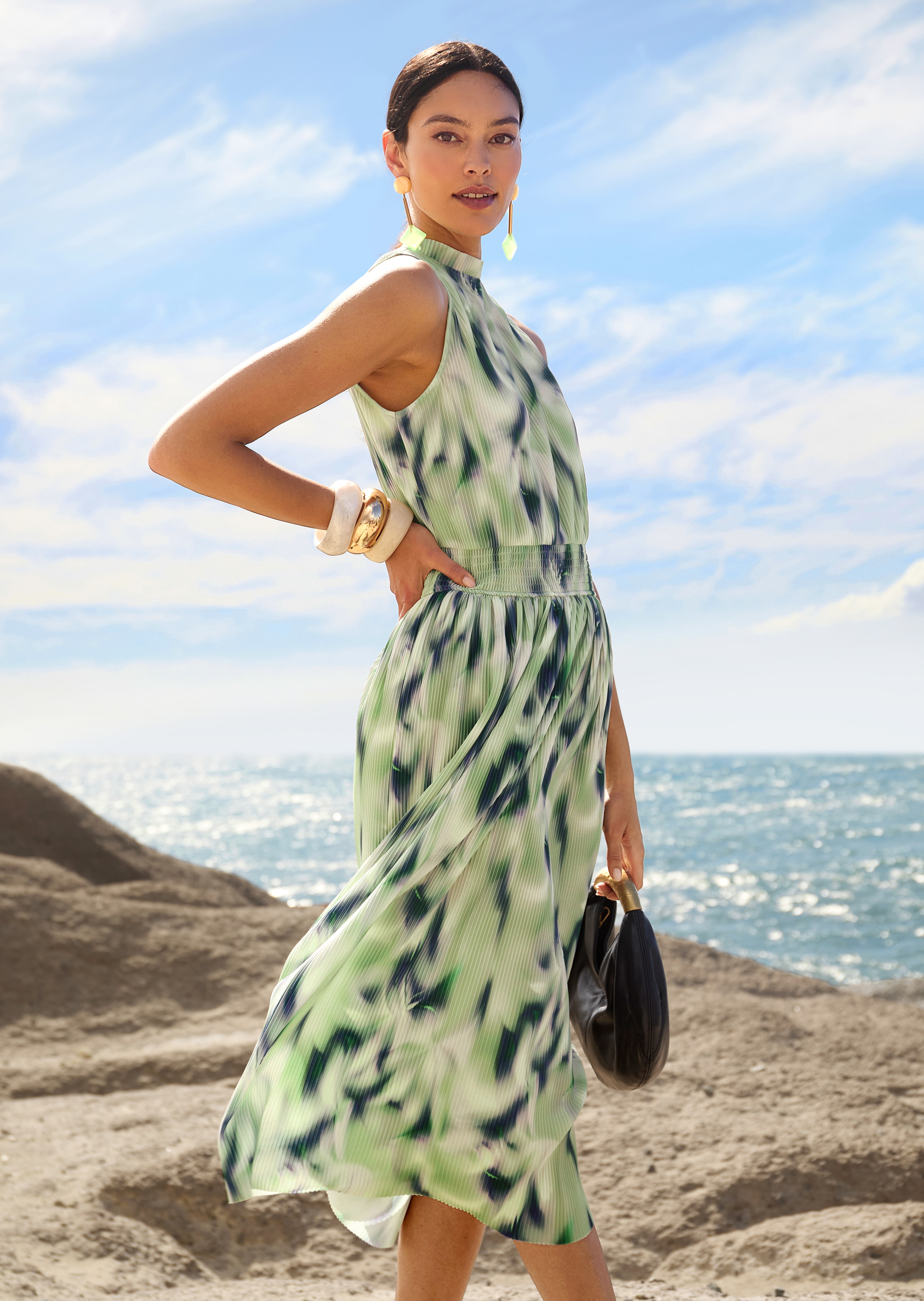 Perfect voor speciale gelegenheden en al die momenten waarop u gewoon goed gekleed wilt zijn. De print in zachte tinten benadrukt de vrouwelijke look, fijn geplisseerde jersey stof met opstaand kraagje en elastische tailleband. Dankzij de split en knoop op de rug is deze off-the-shoulder jurk gemakkelijk aan en uit te trekken.