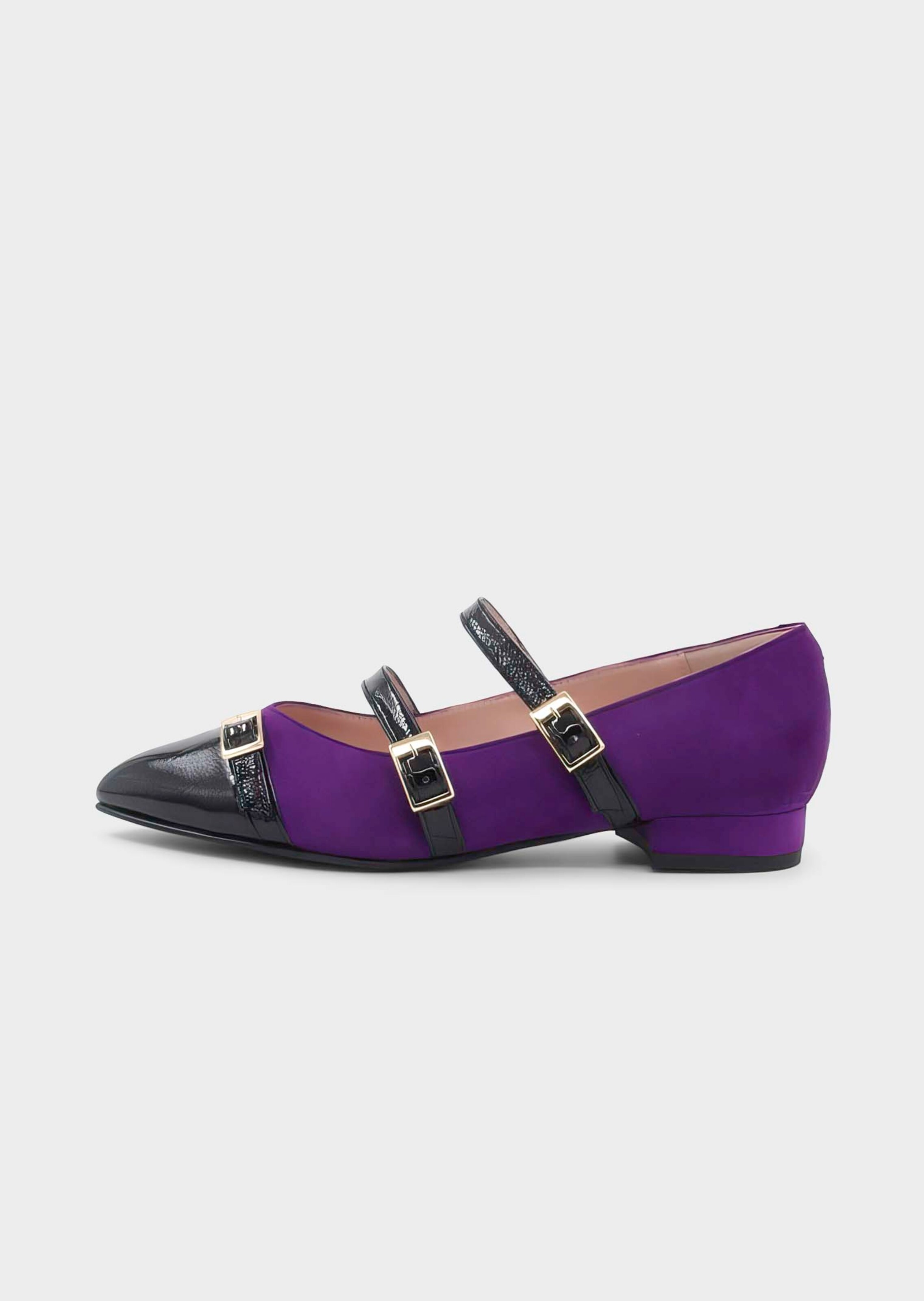 Mix van suèdeleer en lakleer. Twee verstelbare riempjes met goudkleurige gespen.