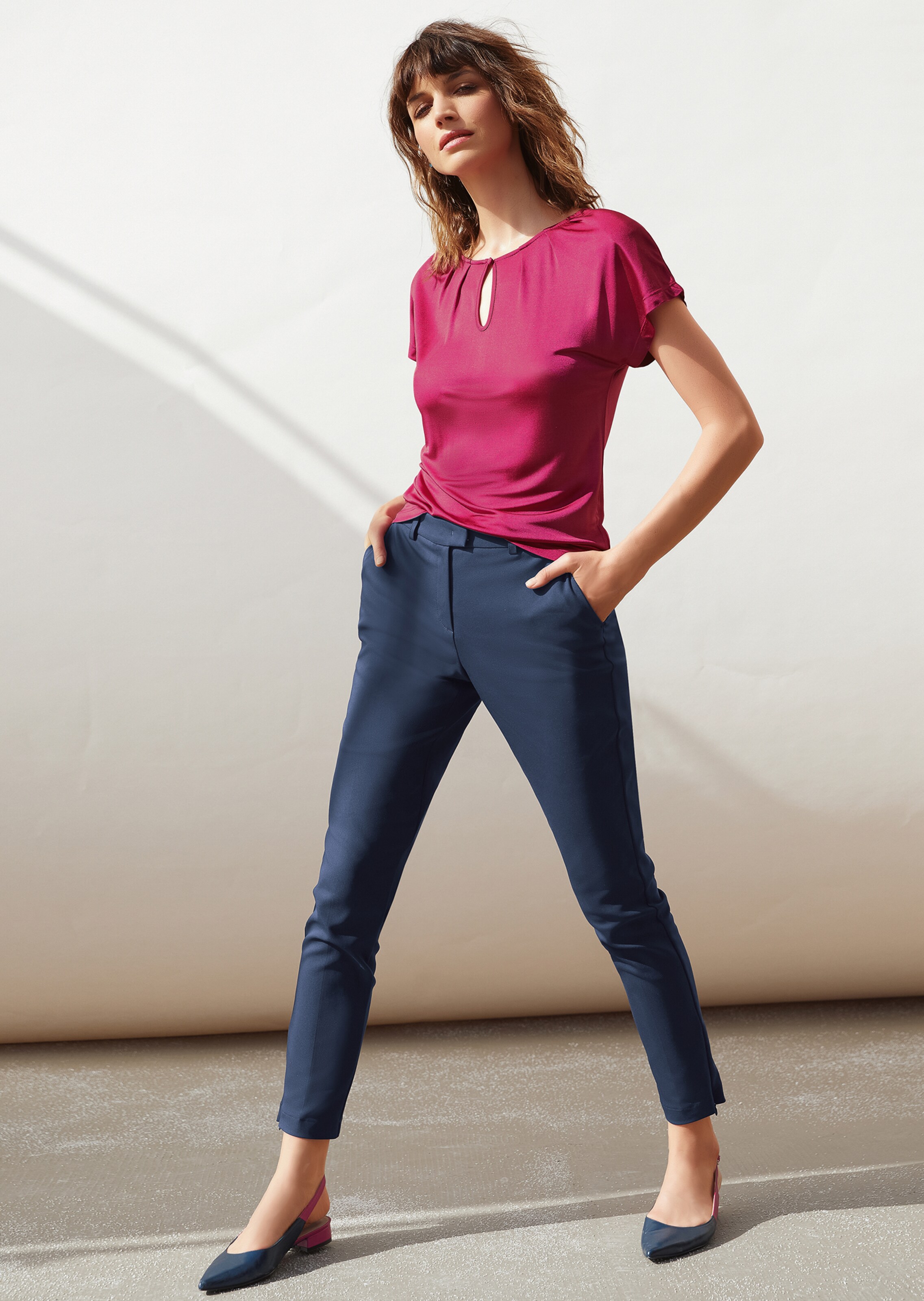 Van zachte, soepele en mooi glanzende jersey met zijde; in een licht getailleerde lijn met ronde hals, aangeknipte schouders en korte mouwen. De halslijn is lichtjes in plooien gelegd en met een splitje en een knoop afgewerkt. Lichte schoudervullingen.