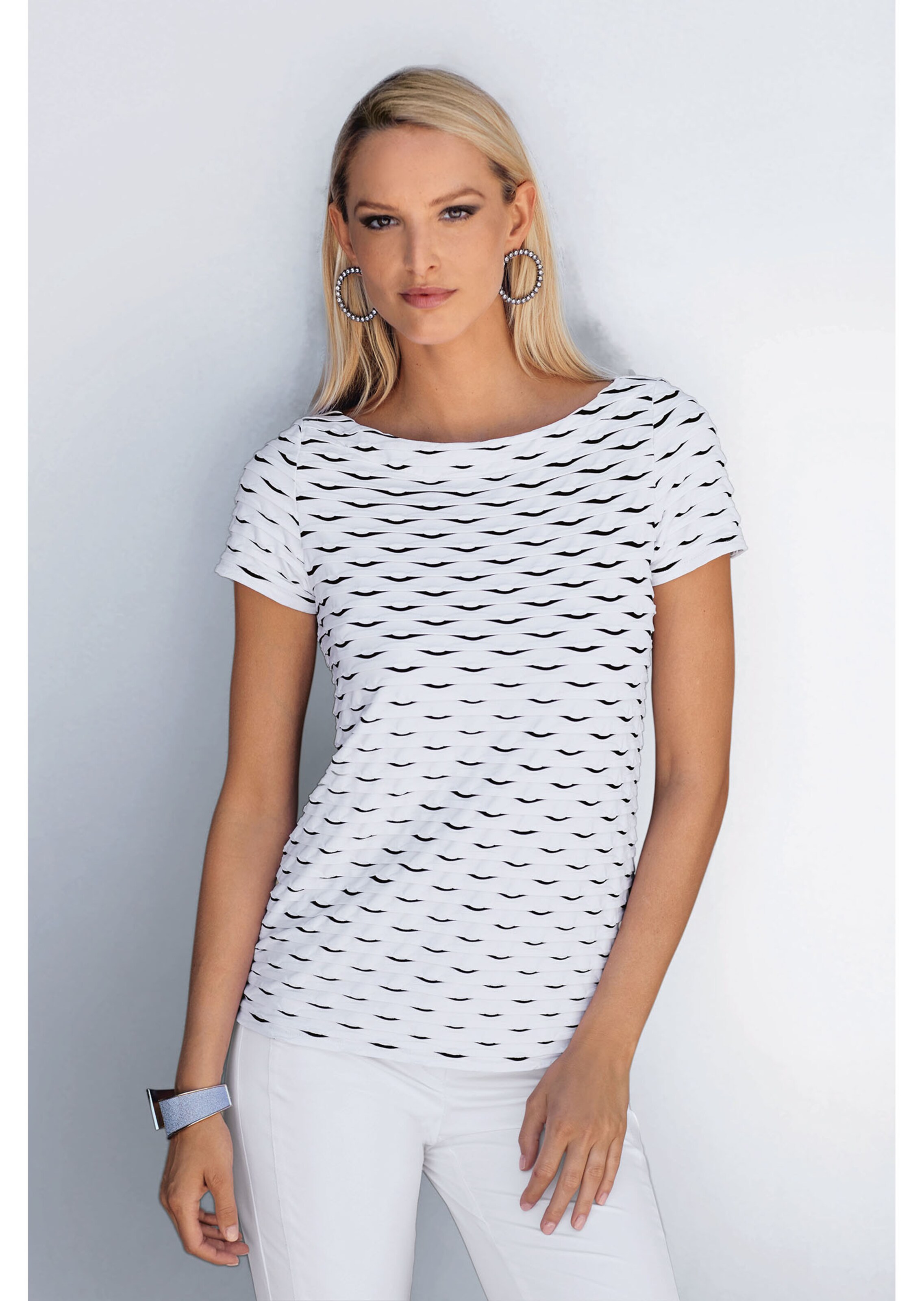Met mooie structuur in twee contrasterende kleuren. Getailleerd model met boothals en korte mouwen.