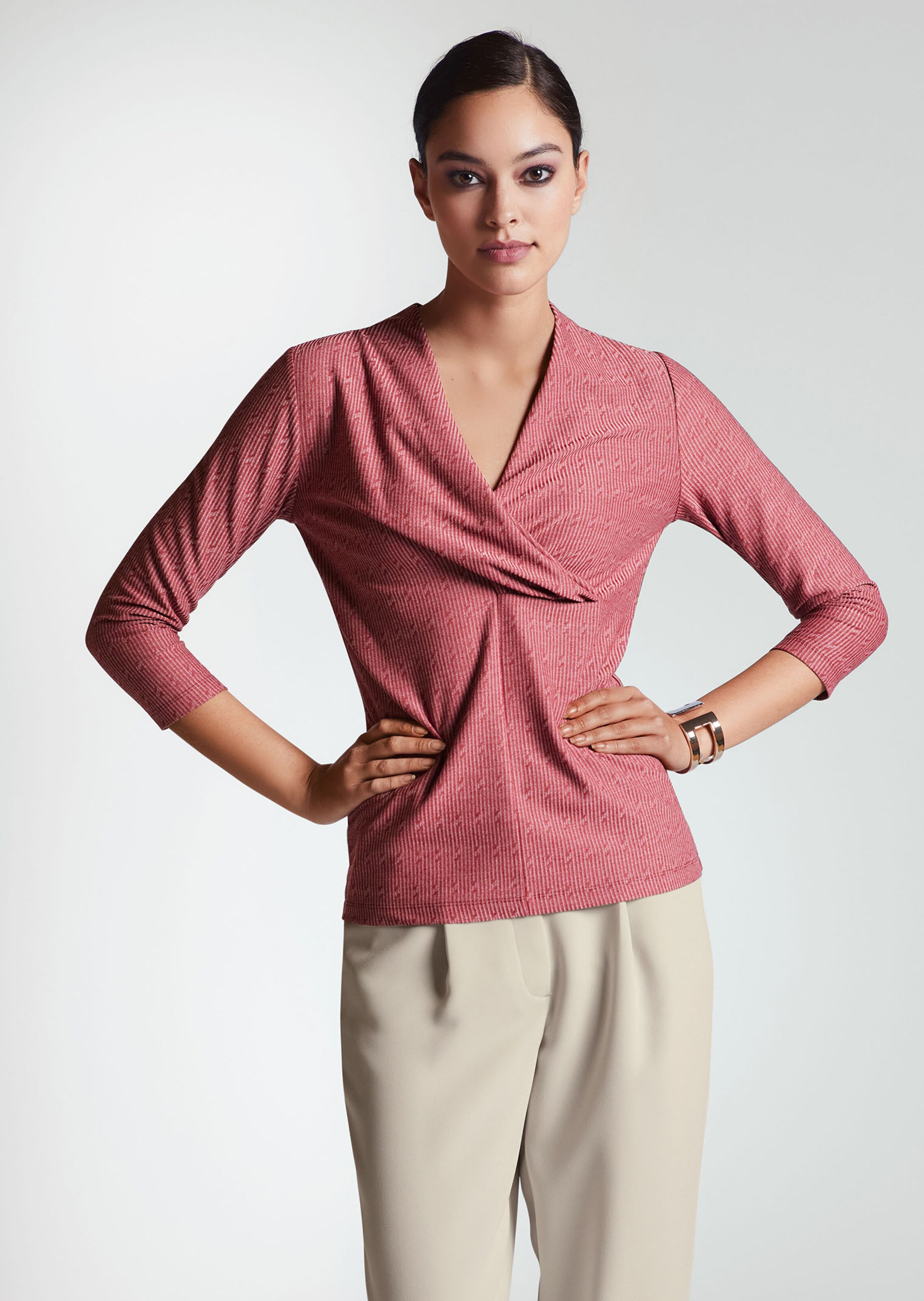 Van comfortabele jersey met structuur. Met 3/4-mouwen en geplooide wikkellook aan de voorkant.