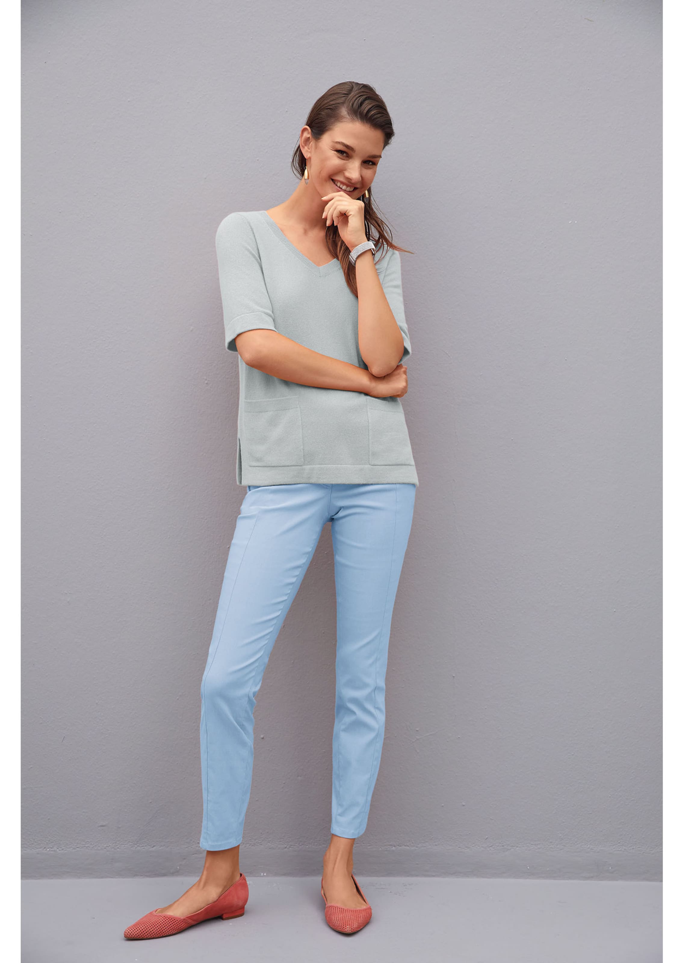 Smal gesneden skinny-fit model met vormgevende tailleband met riemlusjes, zoomsplitjes, ritszakken en opgestikte achterzakken.