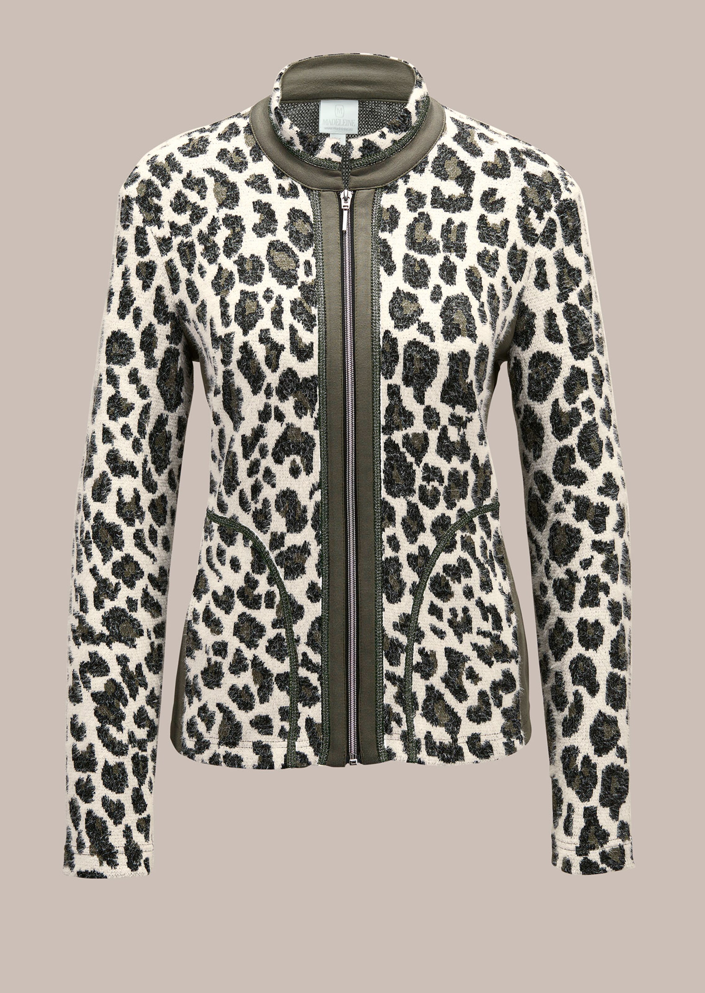 Comfortabele sweatstof in een vrouwelijk, getailleerd, kort model met een trendy luipaardprint all-over. Modieuze look met contrasterende biezen aan de opstaande kraag, ritssluiting voor en de zijkanten. Lange mouwen.