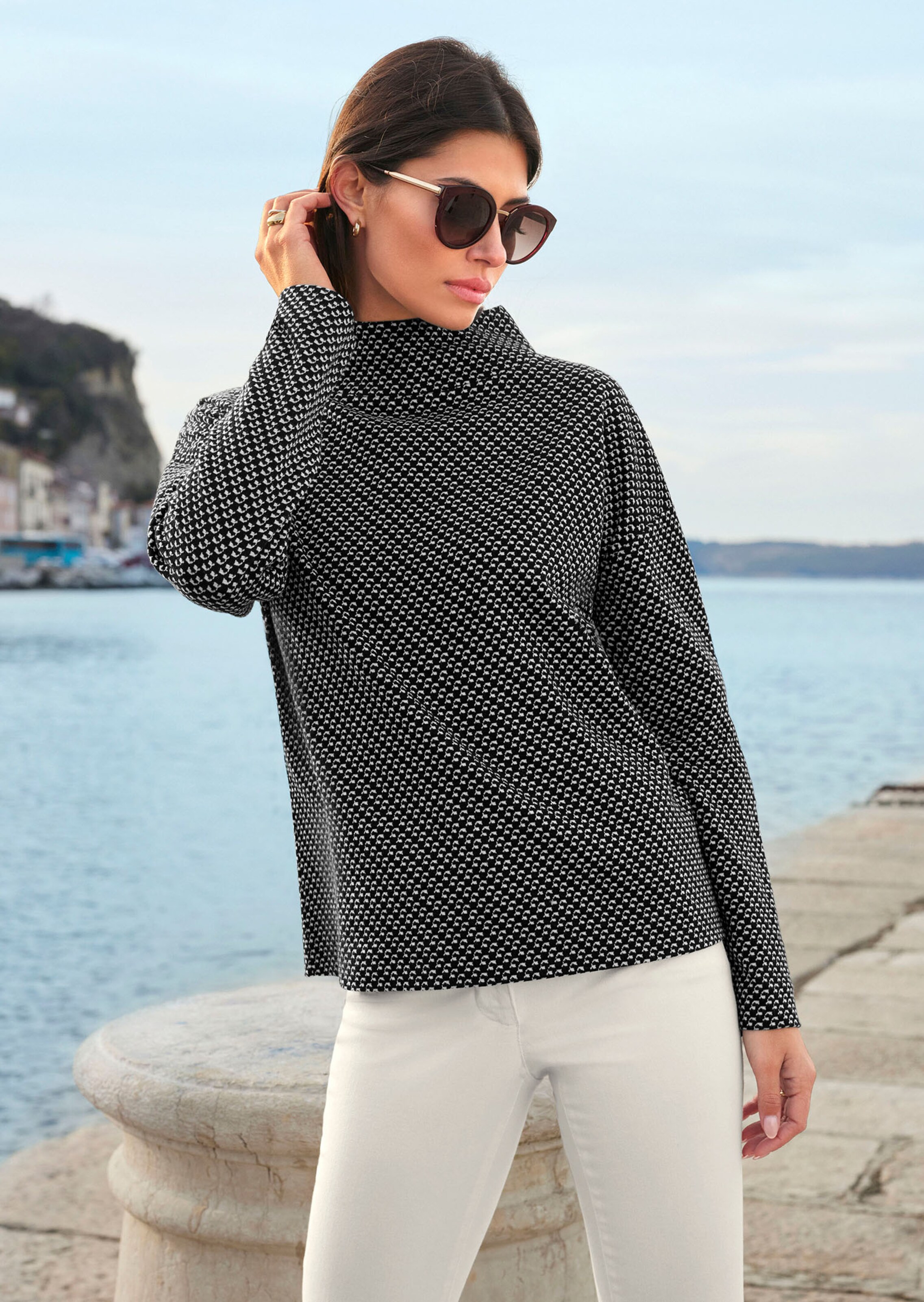Comfortabele stretch, modieus oversized met hoog opstaande kraag, aangeknipte schouders en lange mouwen. Kreukvrij en sneldrogend.