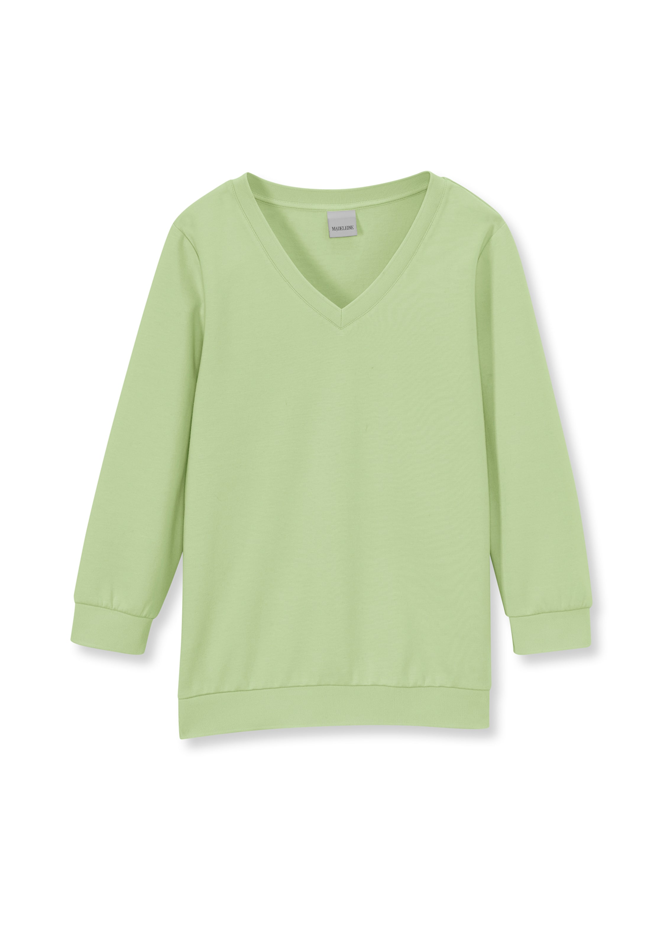 Met V-hals, 3/4-lange mouwen en mooi in model blijvende uiteinden van ribtricot.