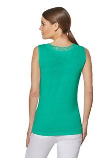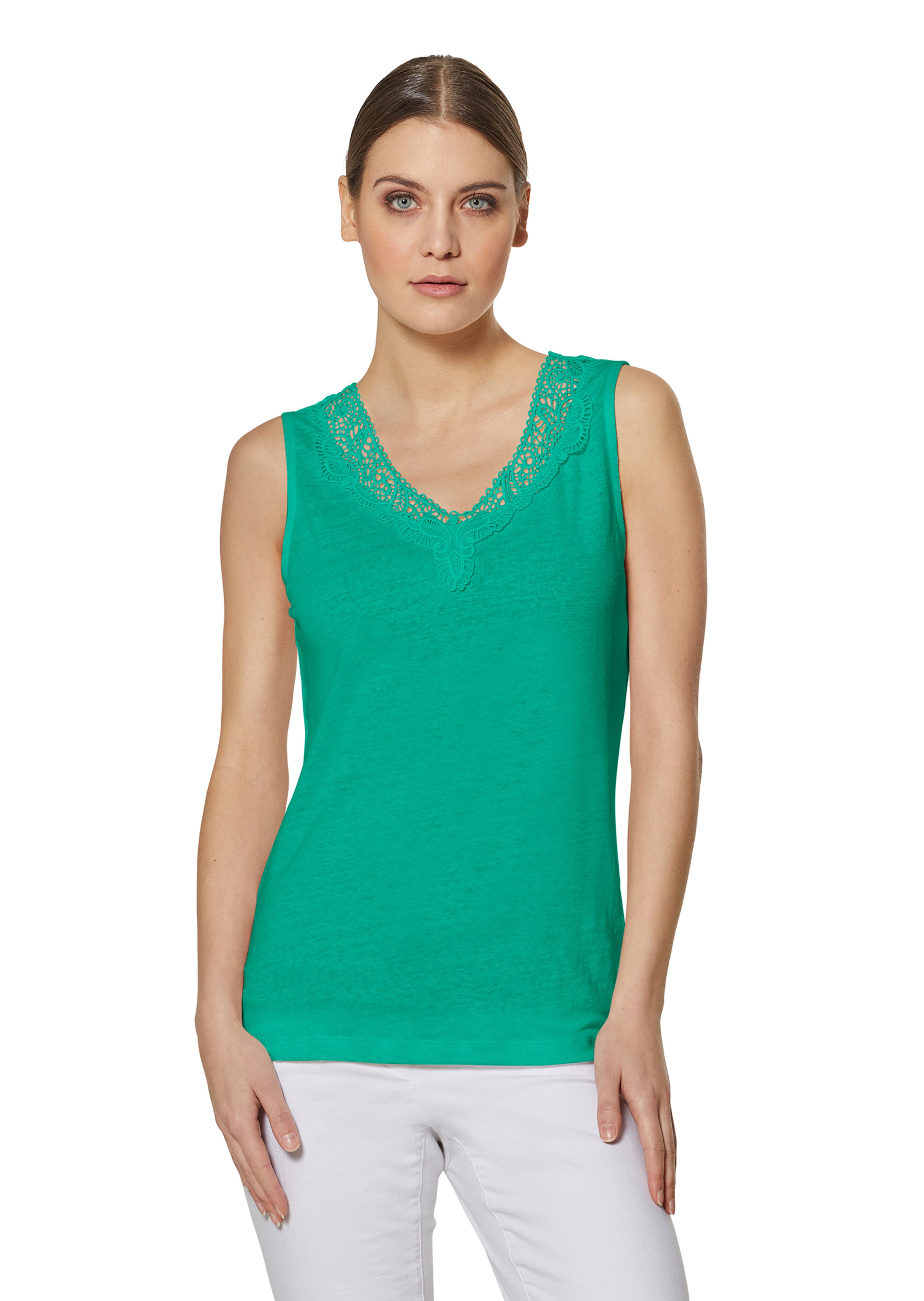 Huidvriendelijk, koel natuurlijk garen, mouwloos en met delicaat kanten inzetstuk bij de V-hals – ook op de rug.