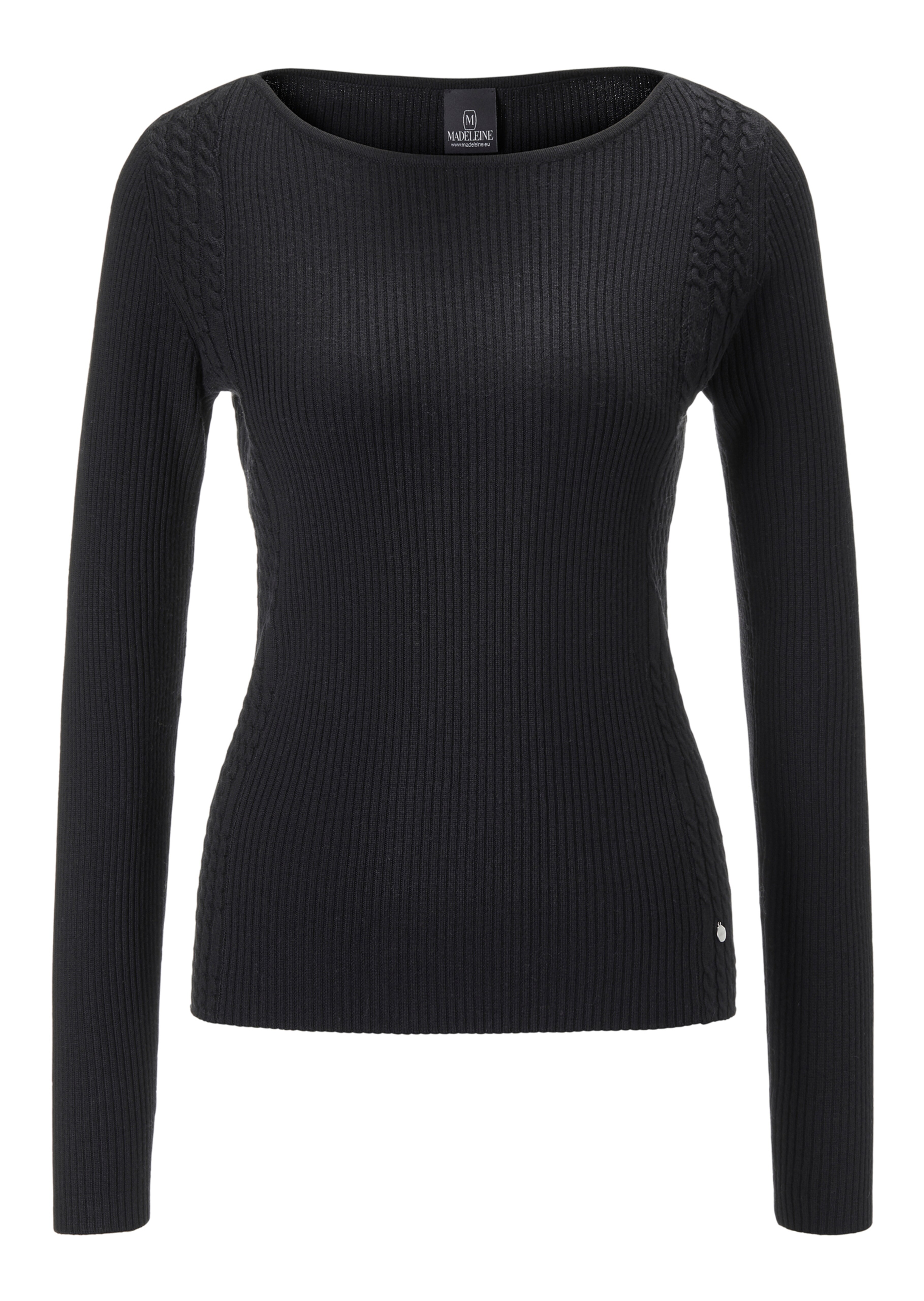 Flatteus zacht natuurgaren in een figuurvriendelijke lijn met boothals en lange mouwen. Lijfje en mouwen in ribtricot, zijkanten in kabeltricot.