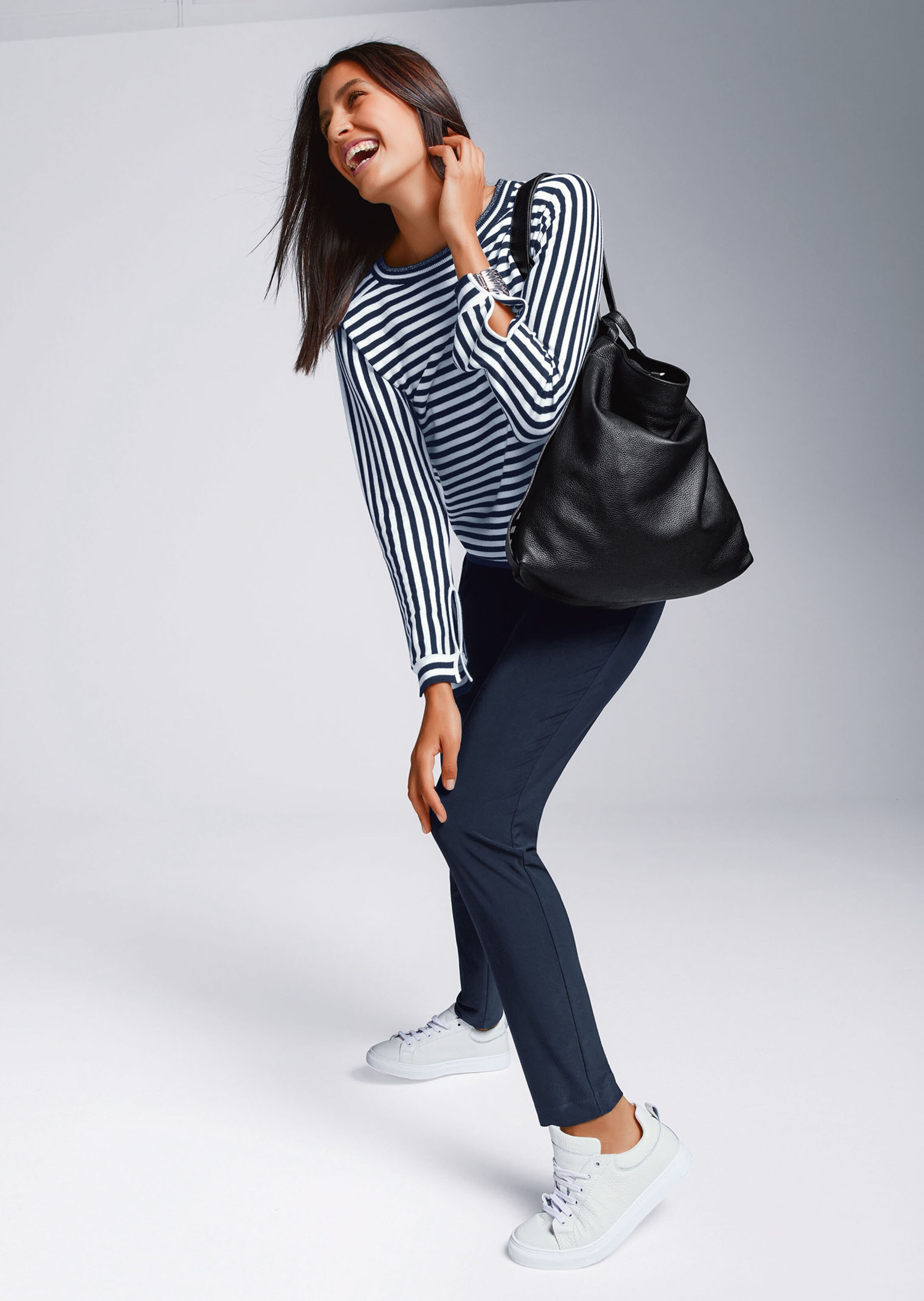 In frivole, tweekleurige strepen met prachtig vormgegeven split in de lange mouwen. Fijne Supima katoen. Aan de boothals met glansgaren geaccentueerd.