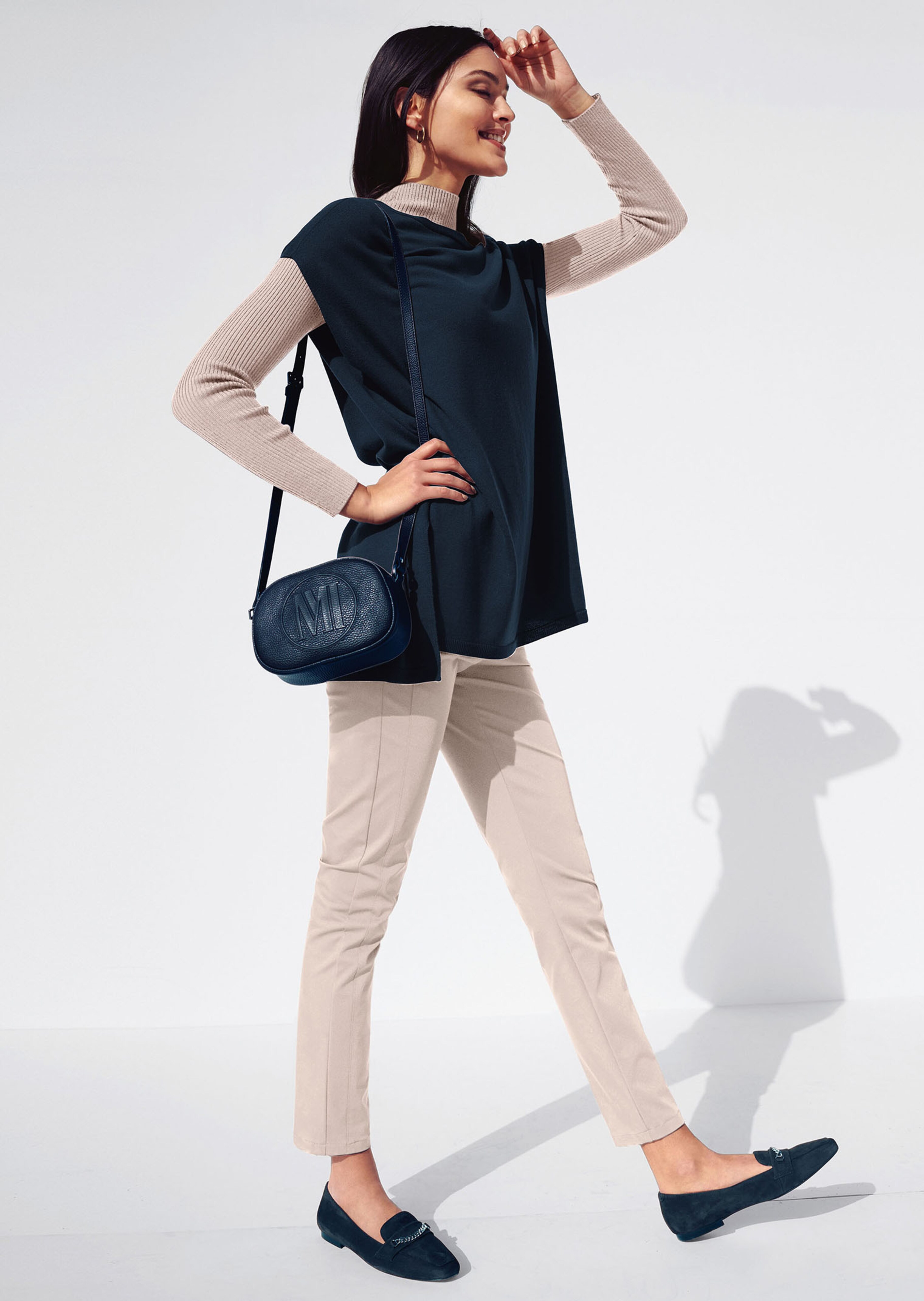Zuiver scheerwol. Trendmodel van hoogwaardige vormtricot met boothals, aangebreide schouderpartij en splitjes opzij. Voor volgens de laatste trend korter gestylt.