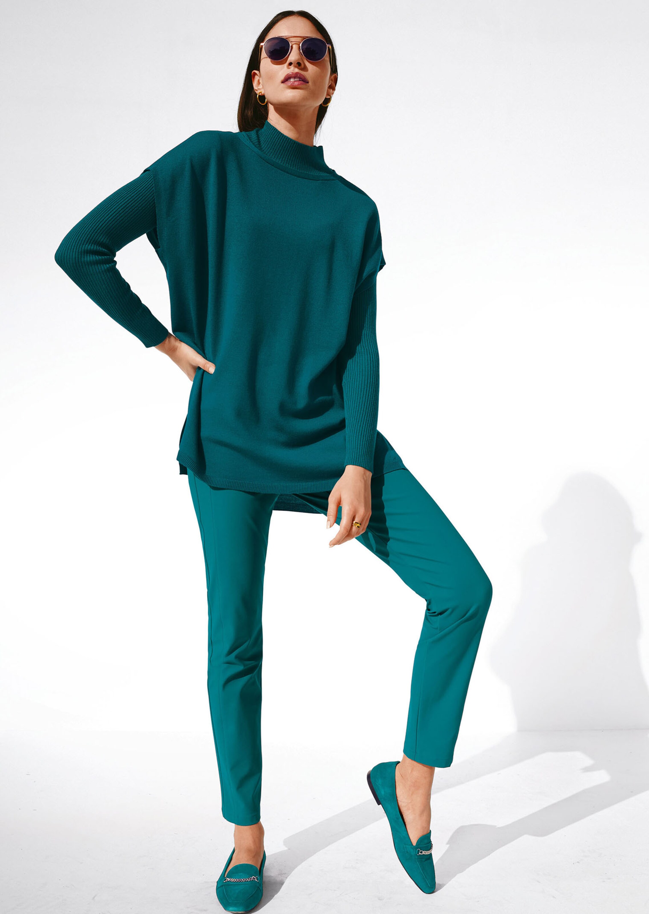 Zuiver scheerwol. Hoogwaardig in model gebreide, verfijnde allrounder in mooie, smal gebreide styling, als ribtricot-variant met opstaande kraag en lange mouwen.