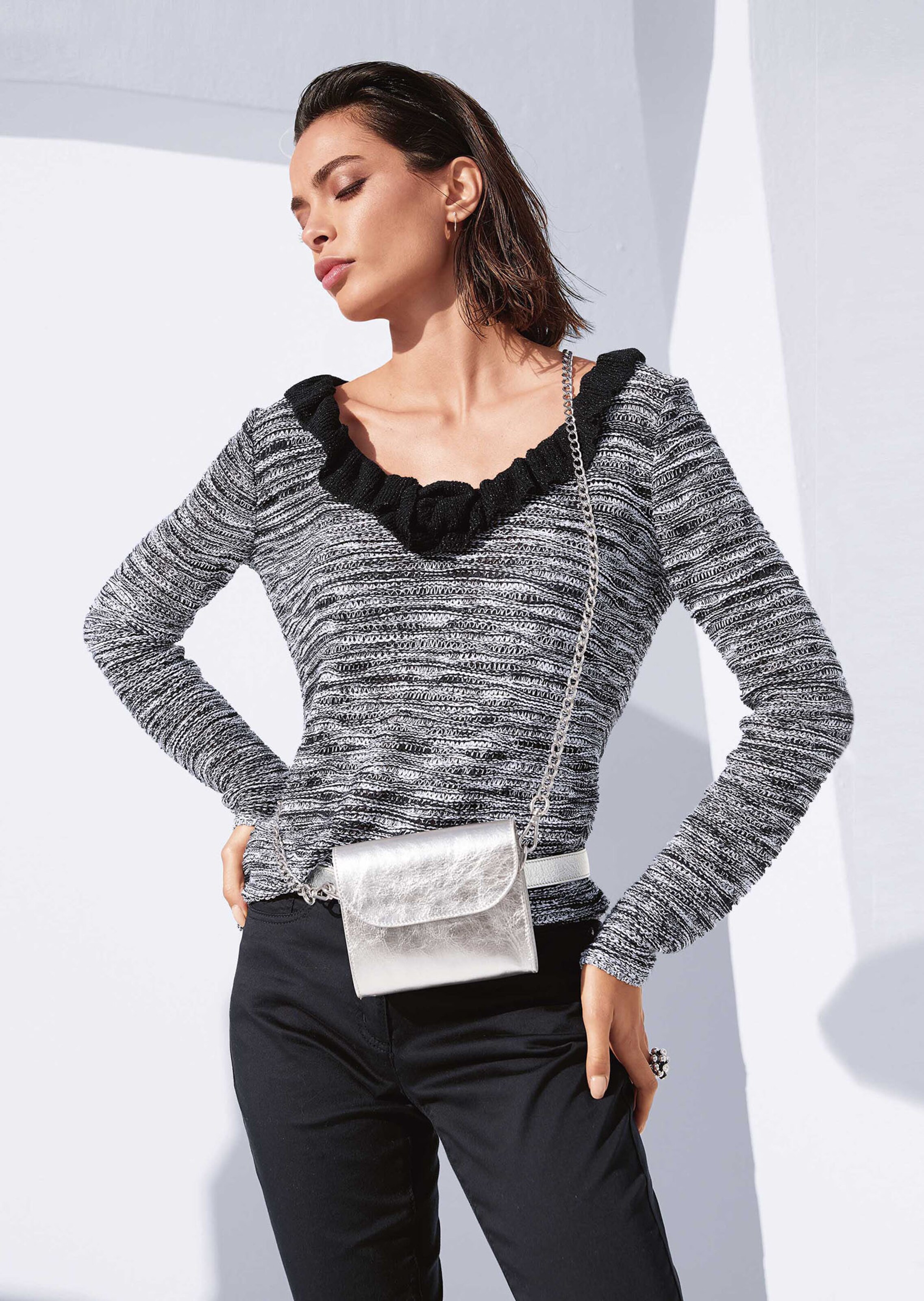 In figuuraccentuerende lijn. Waardevol in model gebreid met contrasterende volantbies aan de zacht afgeronde V-hals. Lange mouwen en zoom met mooi omgeslagen rand in ribtricot.
