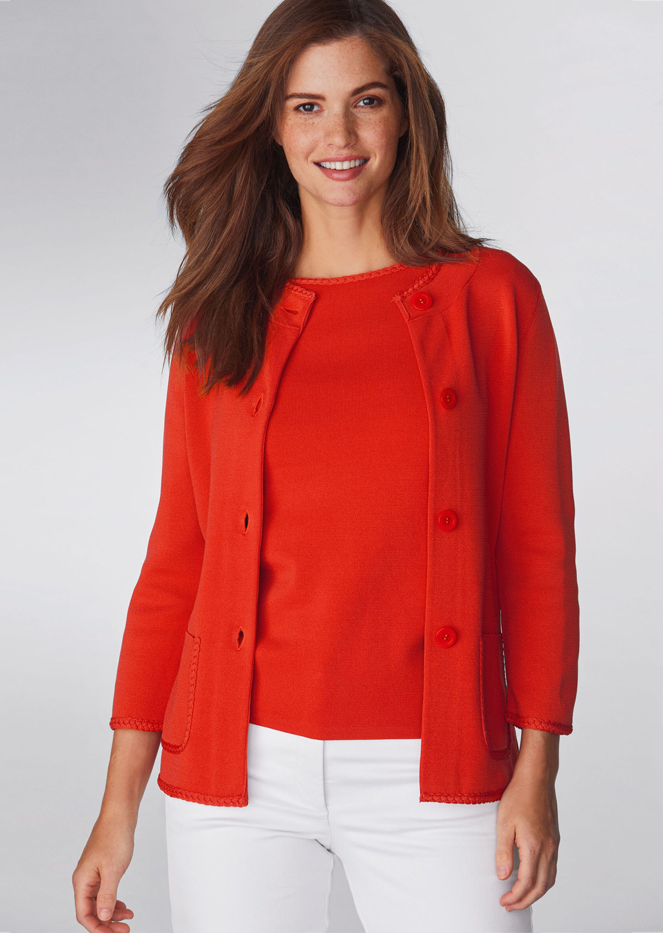 Hoogwaardige Milano-tricot, fully-fashioned met gevlochten accenten. Licht getailleerd en met 3/4-mouwen en boothals.