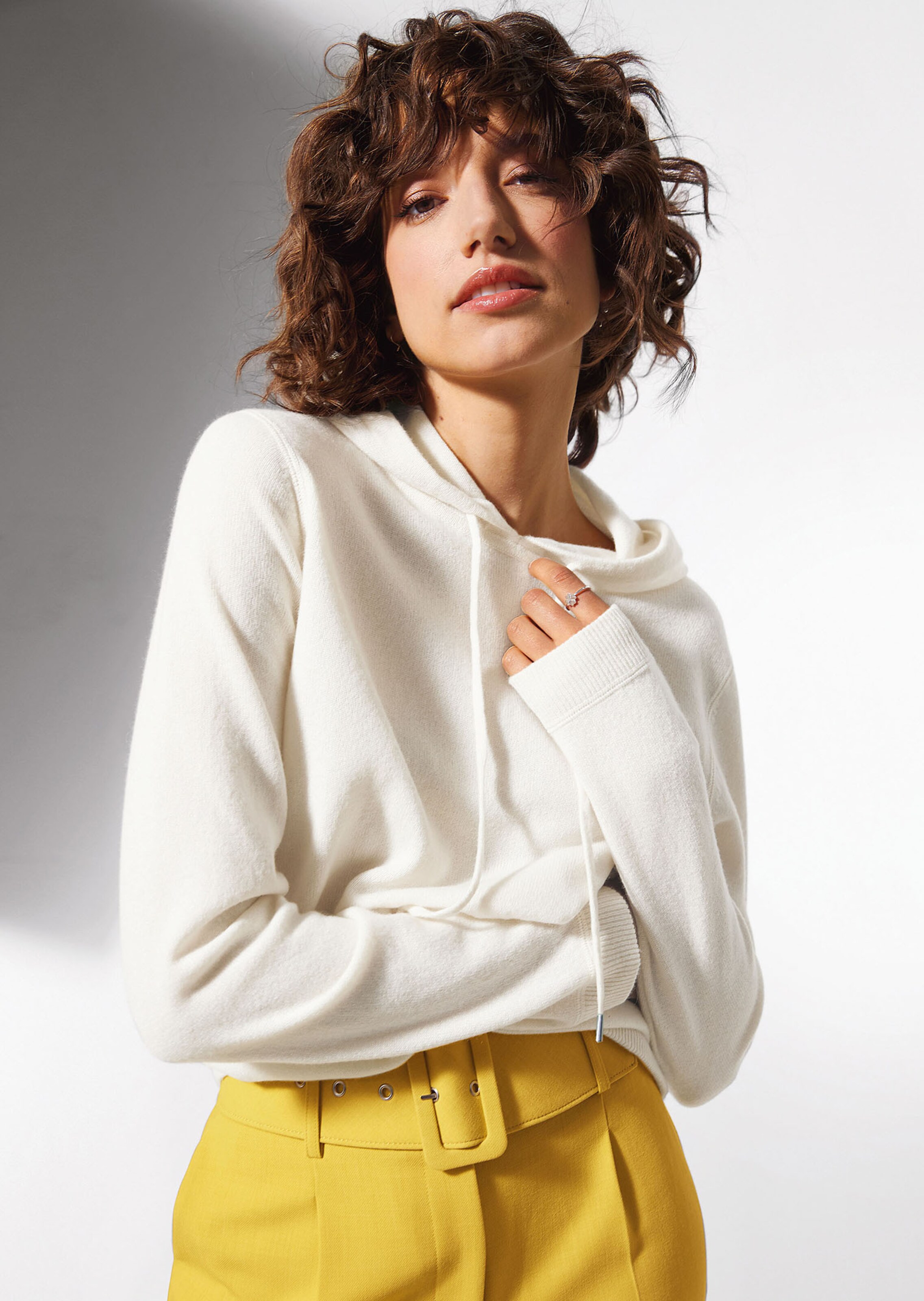 Een huidvriendelijke mix van scheerwol en kasjmier in een prachtig, boxy model. Aangenaam licht en fijntjes gebreid met lange mouwen en een royale capuchon, die met koordjes en metalen stoppers kan worden gereguleerd. De zoomranden zijn met een tunnelkoord te strikken.