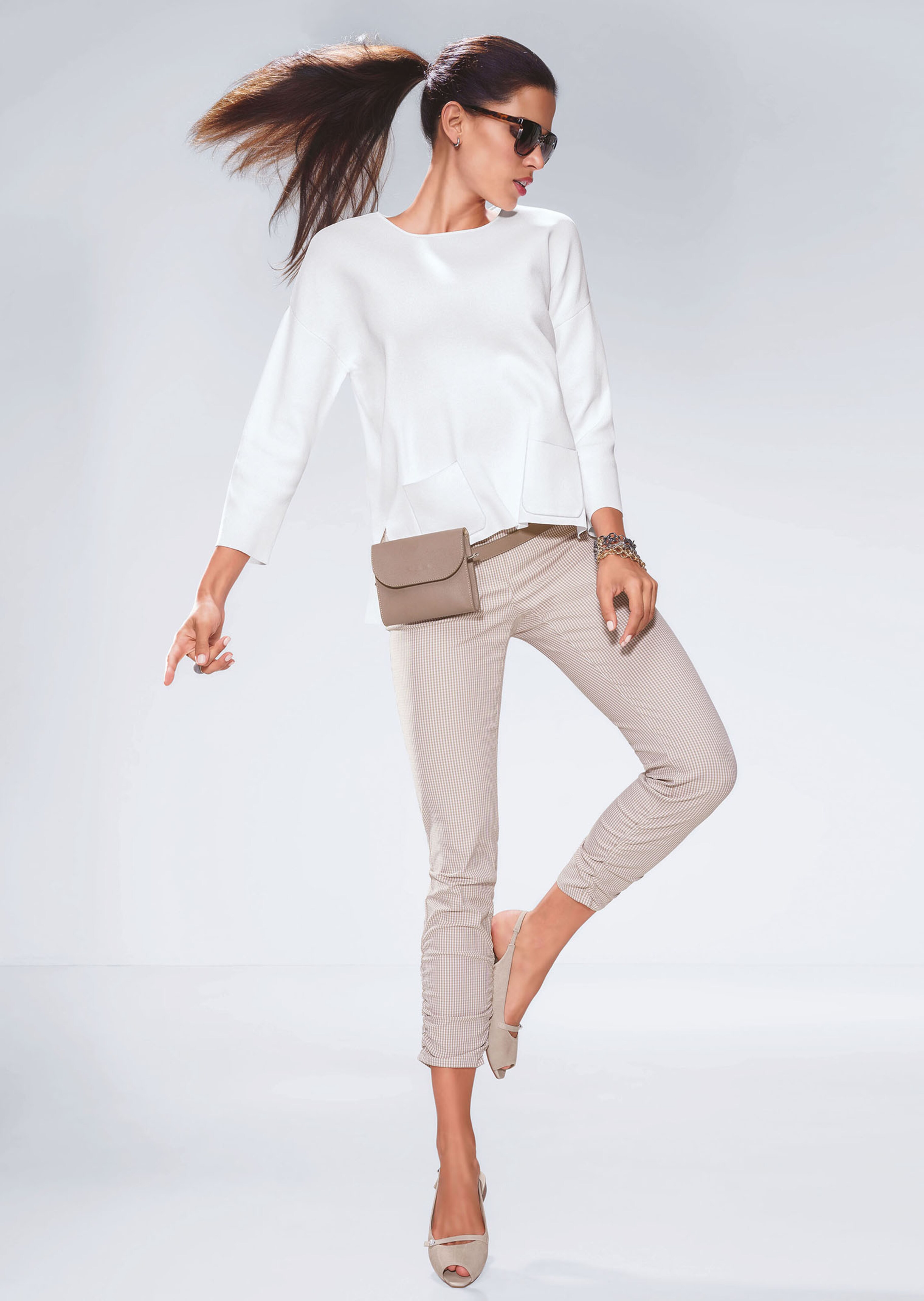 In nonchalant model met modieus verlengde achterkant, 3/4-mouwen, opgestikte zakken en splitjes opzij. De ronde halslijn is in de nek met een knoop te sluiten.