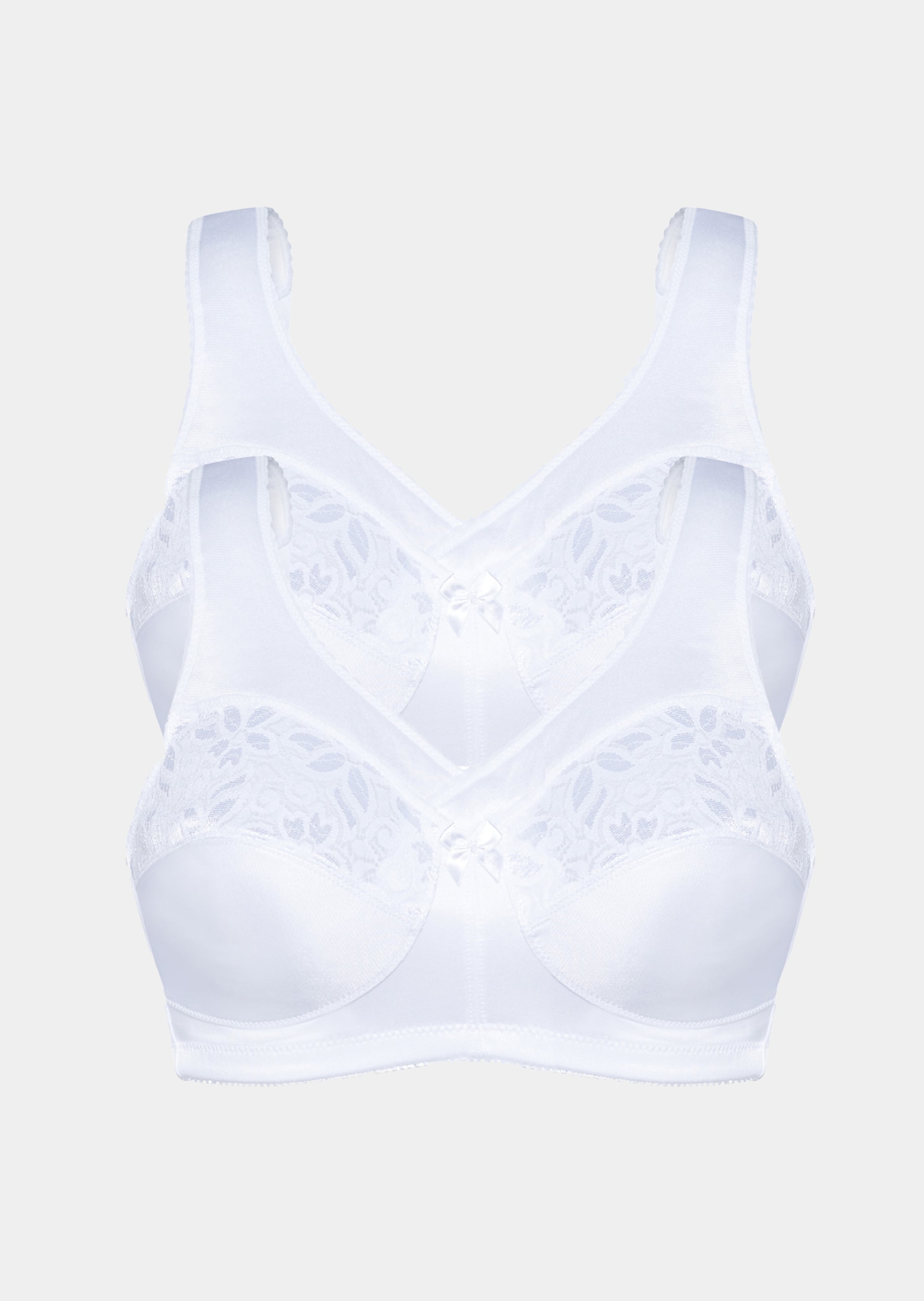 Twee ontlastende beha's zonder beugels. Het model van SUSA zorgt met steunende stroken, een gevoerde onderborstband en gewatteerde schouderbandjes voor optimaal comfort. De naadgevormde cups zijn bovenaan met een gebloemde, kanten strook gegarneerd. Het verder gladde materiaal heeft een fijne glans. Schouderbandjes en haakjessluiting achter verstelbaar.