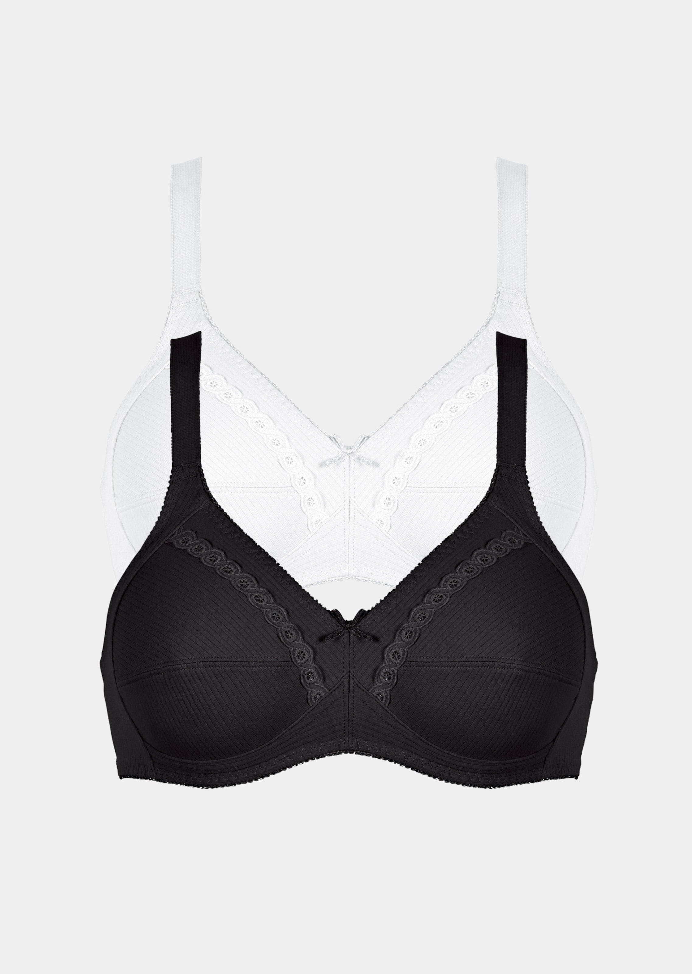 Twee beha's zonder beugels van NATURANA – kies een zwarte of skin beha en ontvang daarnaast een wit exemplaar! De naadgevormde beha van puur katoen heeft een fijne ribstructuur en een decoratieve kanten band langs de bovenste cuphelften. Een zachte, elastische onderborstband en achter verstelbare, elastische schouderbandjes zorgen voor bijzonder comfort. Met 3-voudig verstelbare haakjessluiting.