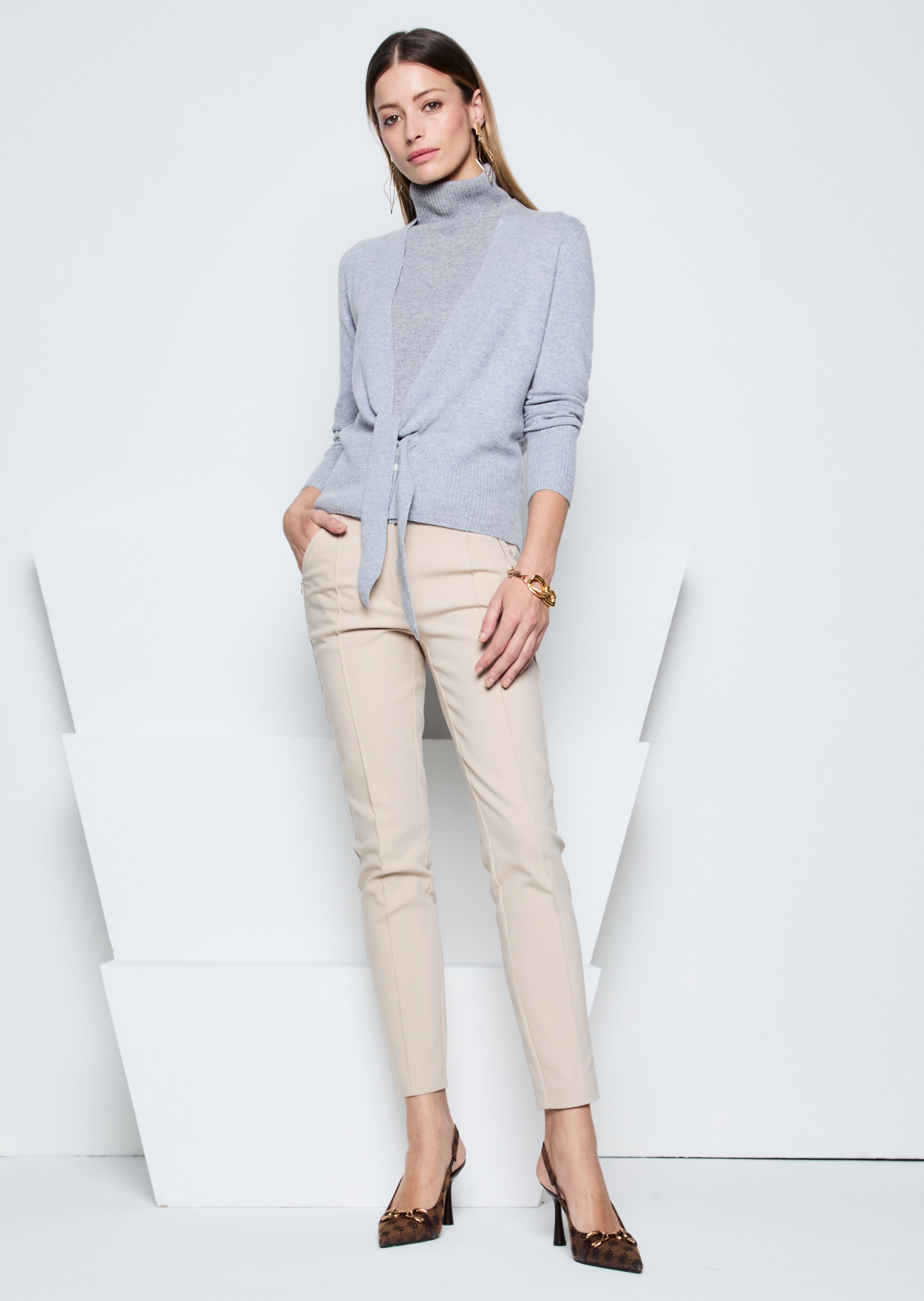 Chique, luxe tricot in 2-ply kwaliteit; bijzonder zacht, licht en heerlijk warm. Hoge ribboord aan de tailleband, de lange mouwen en aan de diepe V-hals met striklint. Parelmoeren knopen.