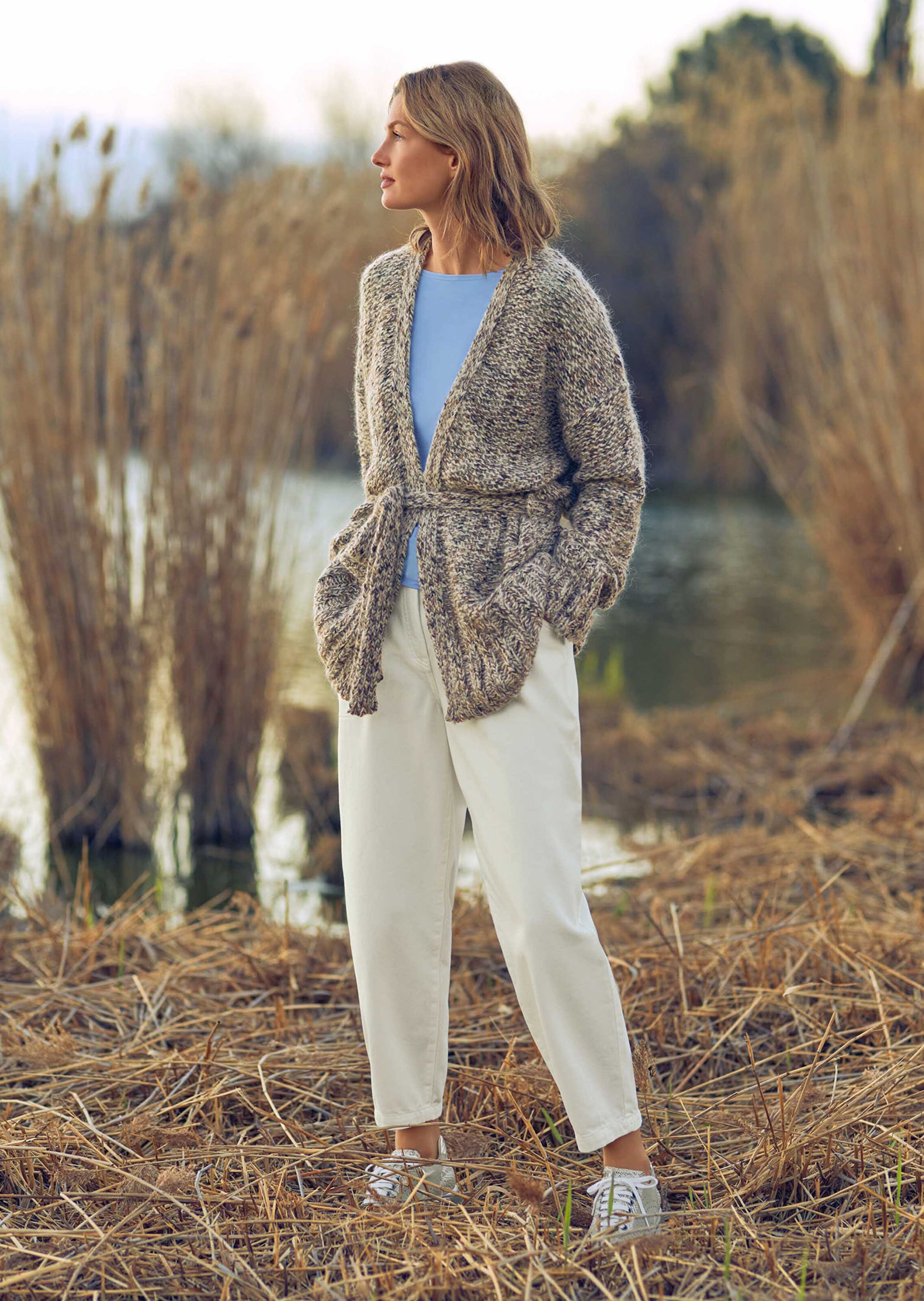 Cosy chic van hoogwaardig, Italiaans, meerkleurig garen met decente glanseffecten. Casual model met een geaccentueerde rand aan de voorkant, strikceintuur en geribde uiteinden aan de mouwen en de zoom.