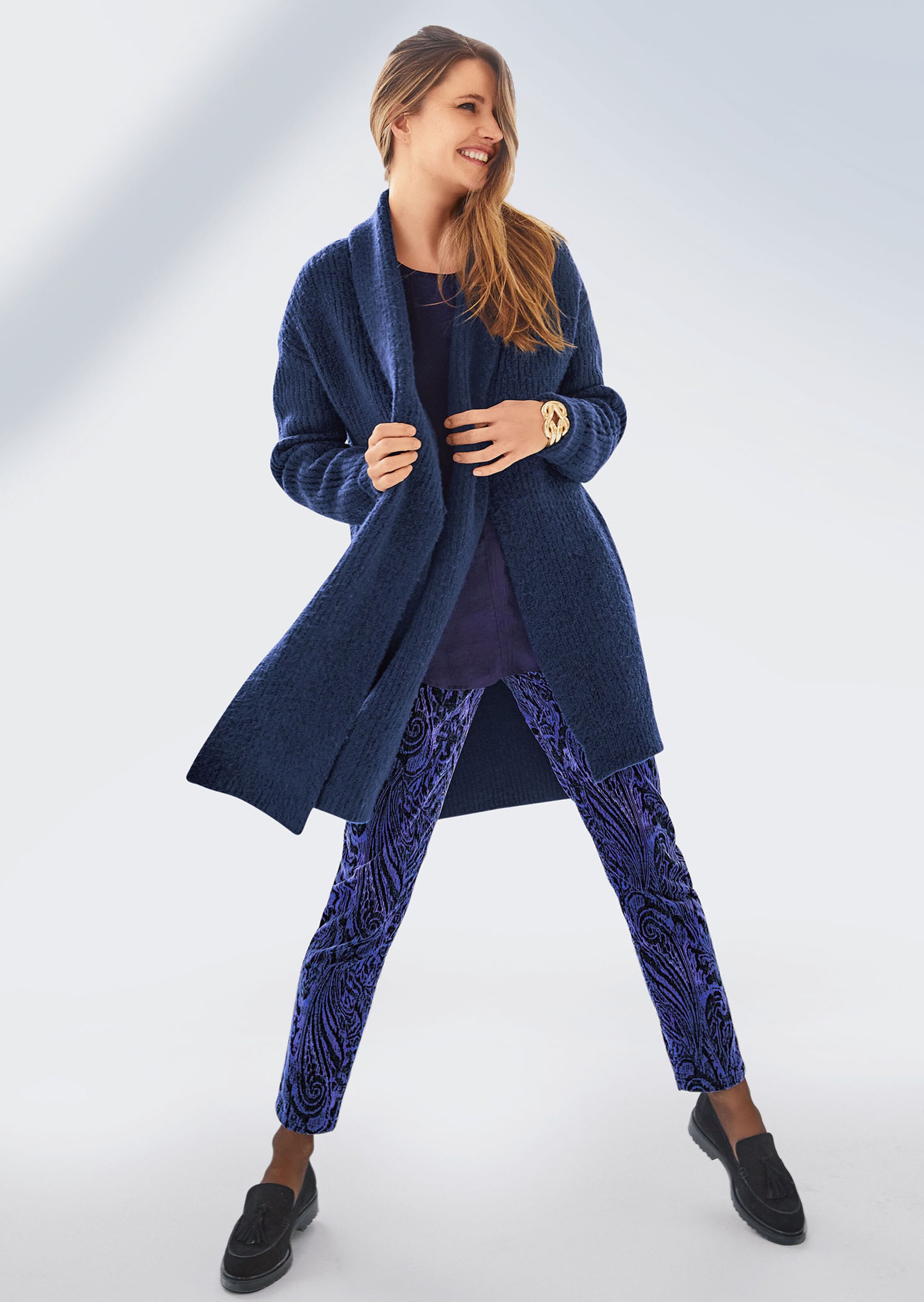Behaaglijk, grof breisel in nonchalant oversized model met sjaalkraag, splitje dat kan worden gesloten, steekzakken in de naad opzij en opstaande kraag aan de achterkant.
