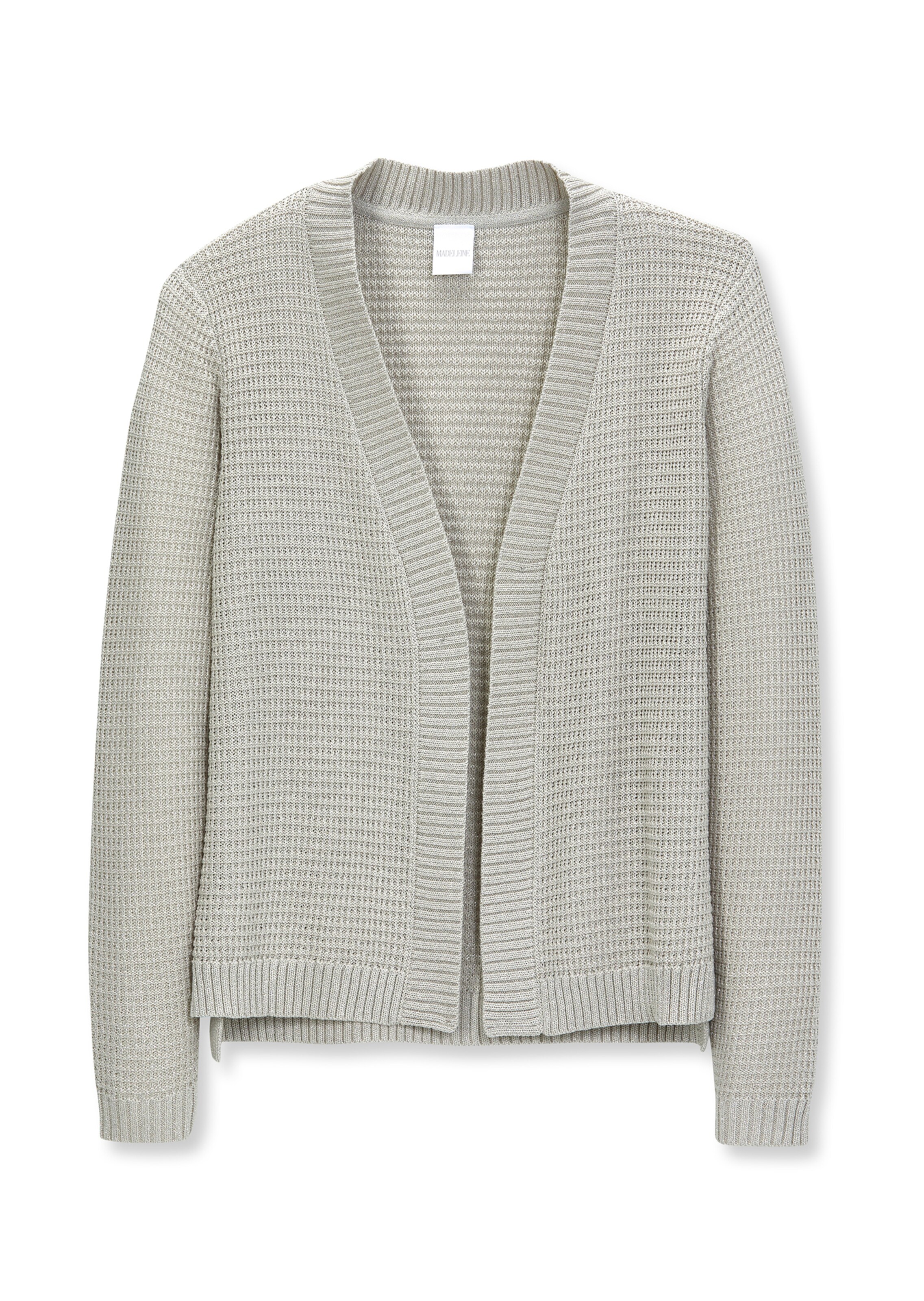 Met markante structuurtricot en een fijn glansgarenaccent. Aan de achterkant verlengde stijl met splitten opzij, ribboorden, V-hals en lange mouwen.