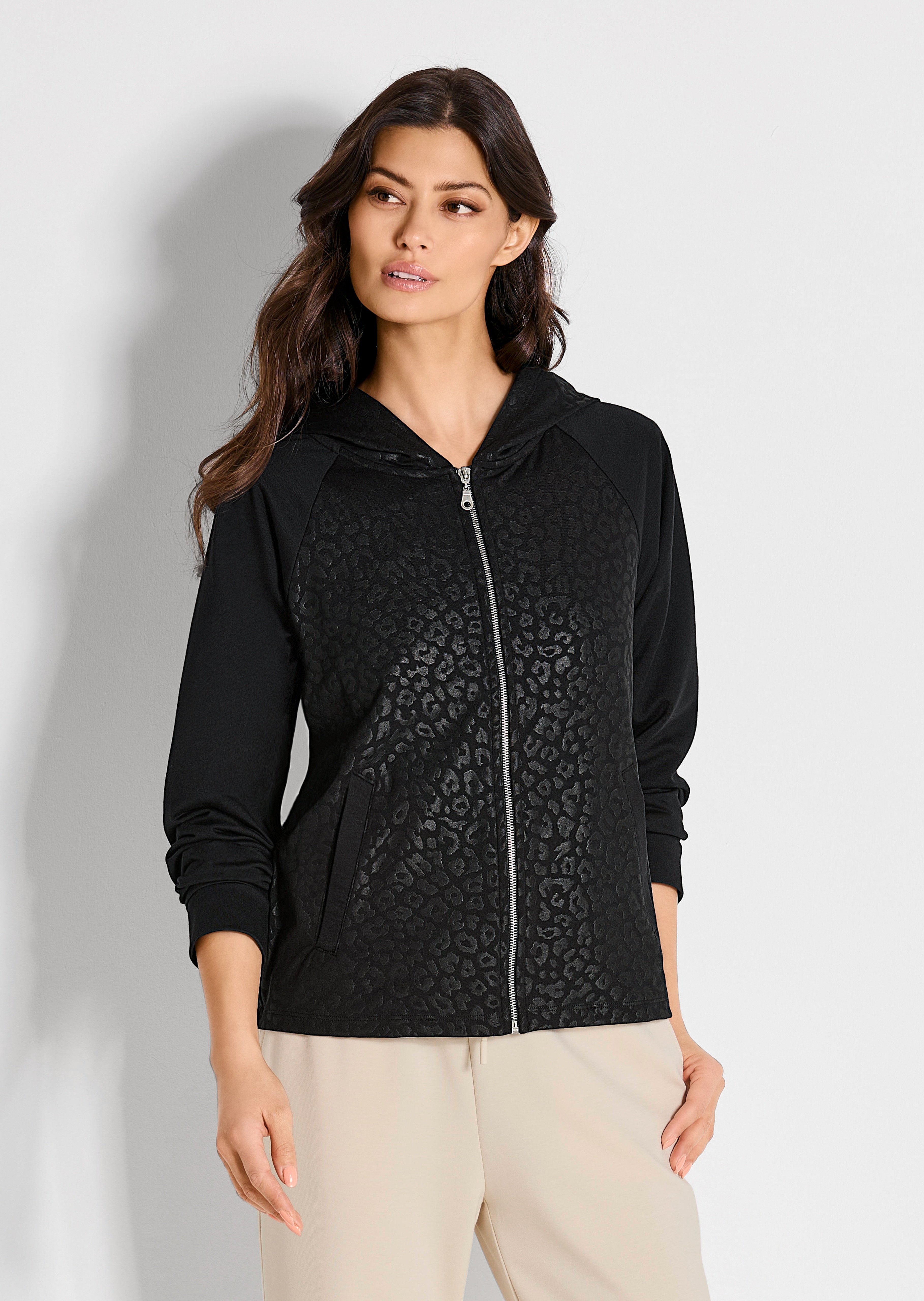 Vrijetijdsjack met animal-stempeldruk. Raglanmouwen, capuchon, ritssluiting en zakken opzij. Jersey met Elastan.