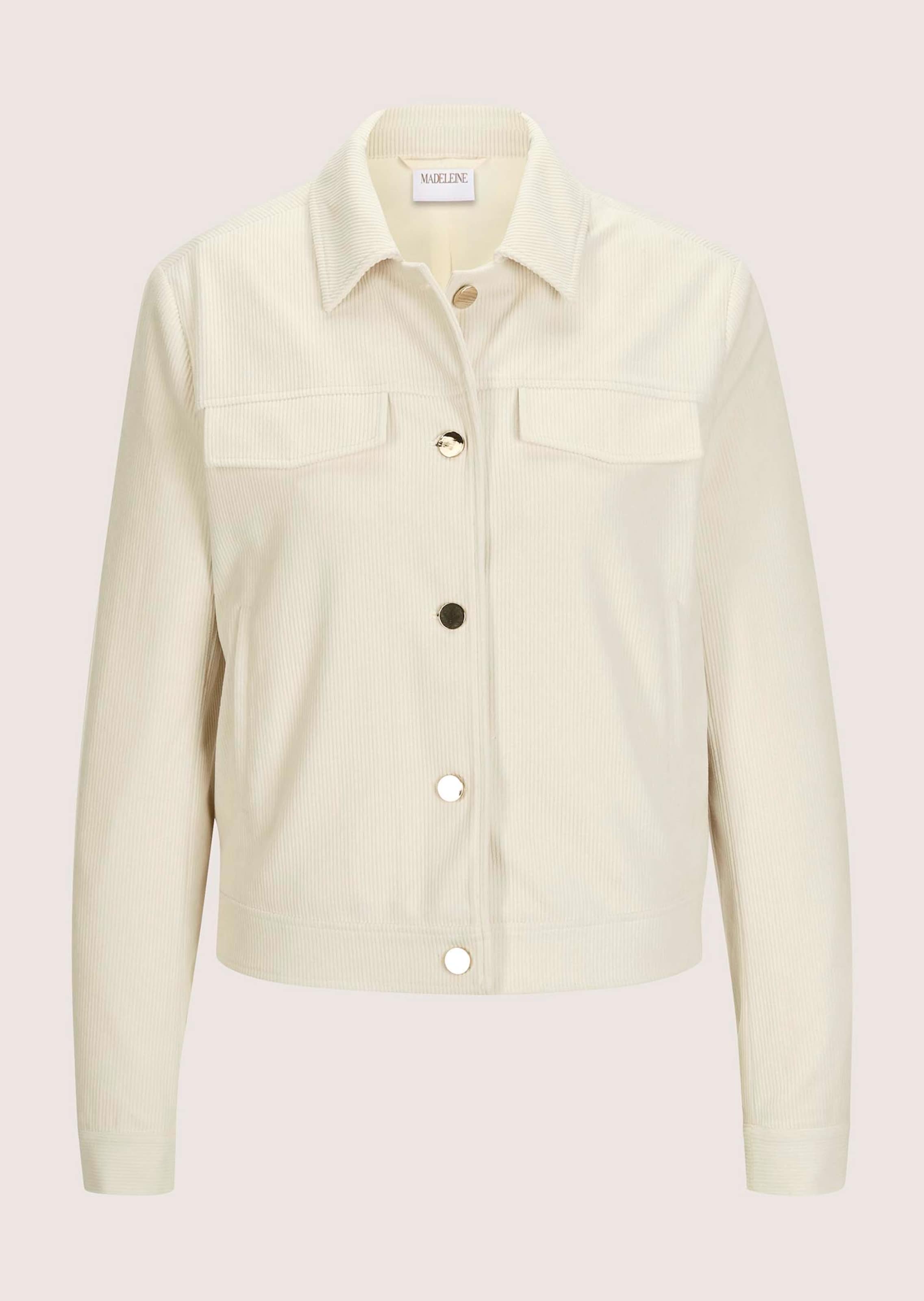 Kort model in een zachte corduroy-look. Overhemdkraag, goudkleurige knopen en lange mouwen met manchetten. Met opgestikte borstzakken met een klepje en paspelzakken.