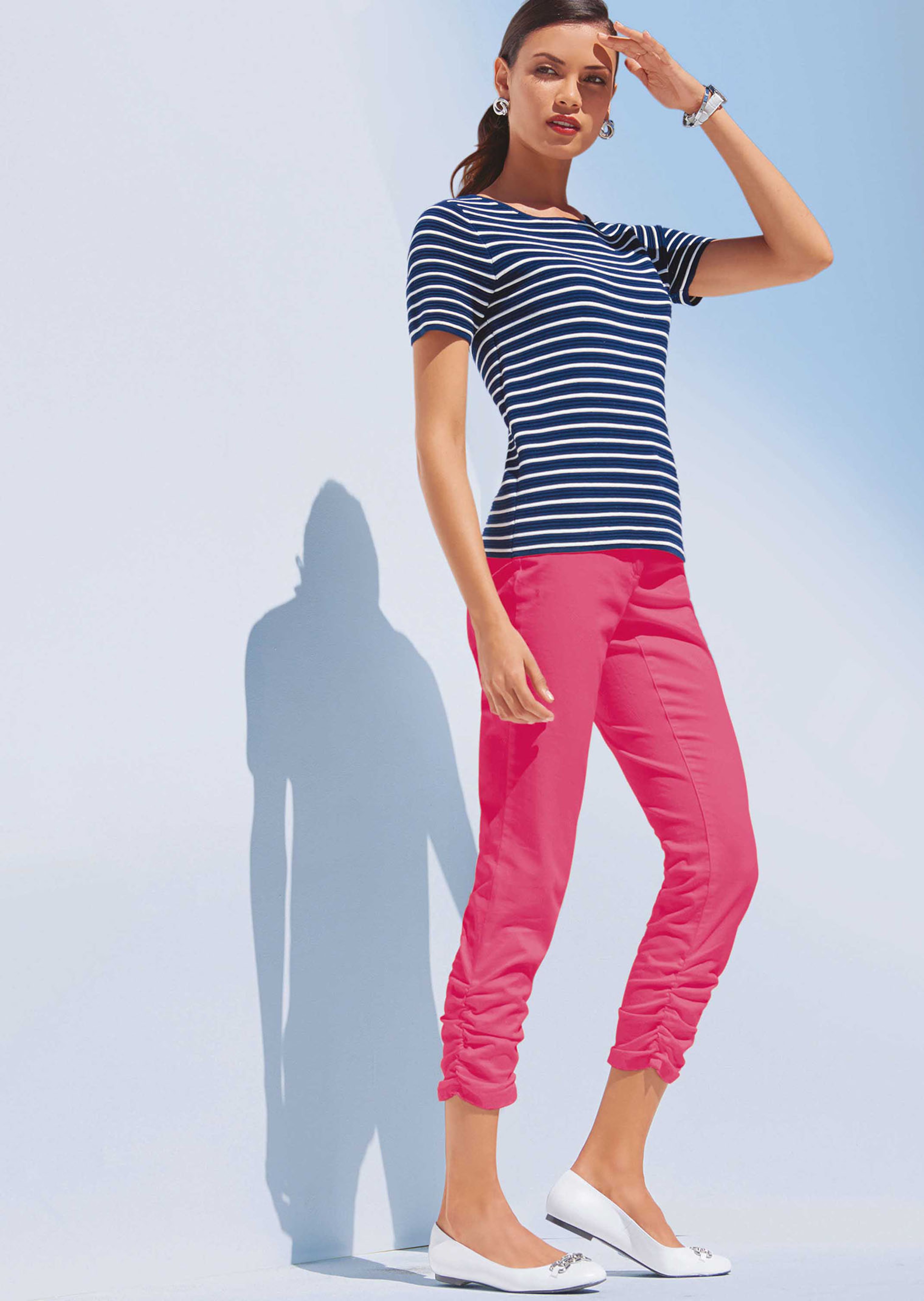 Der Akzent setzt den Trend: Seitliche Raffungen am Beinabschluss machen den verkürzten Style so feminin. Schlanke Five-Pocket-Hose in aktueller 7/8-Länge mit rückwärtigem Sattel, Fancy-Knopf und Nieten. Formbund mit Gürtelschlaufen. Dank Stretchanteil sitzt die Slimline-Hose perfekt und komfortabel zugleich.
