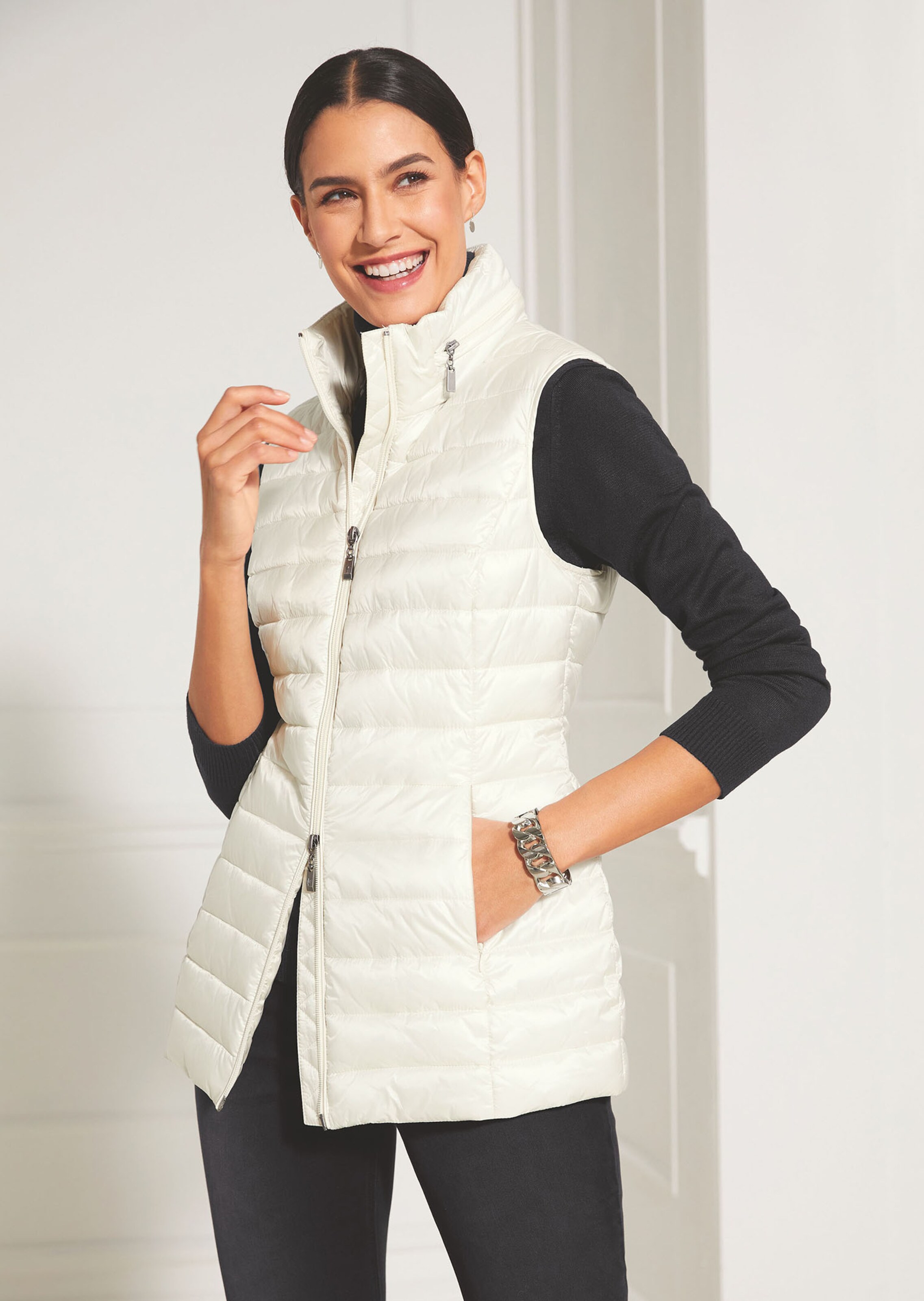 Ein lässig sportiver Modepartner, der die Body-Partie angenehm warm hält und Pep in den Style bringt. Weich wattierter, ärmelloser Sandwich-Stepp wird per Zwei-Wege-Zipper geschlossen und ist leicht tailliert. Der Stehkragen der Weste beinhaltet eine Kapuze und schützt so vor unangenehmen Überraschungen. Nahttaschen mit Zipper und ein Kettenaufhänger machen den Look komplett.