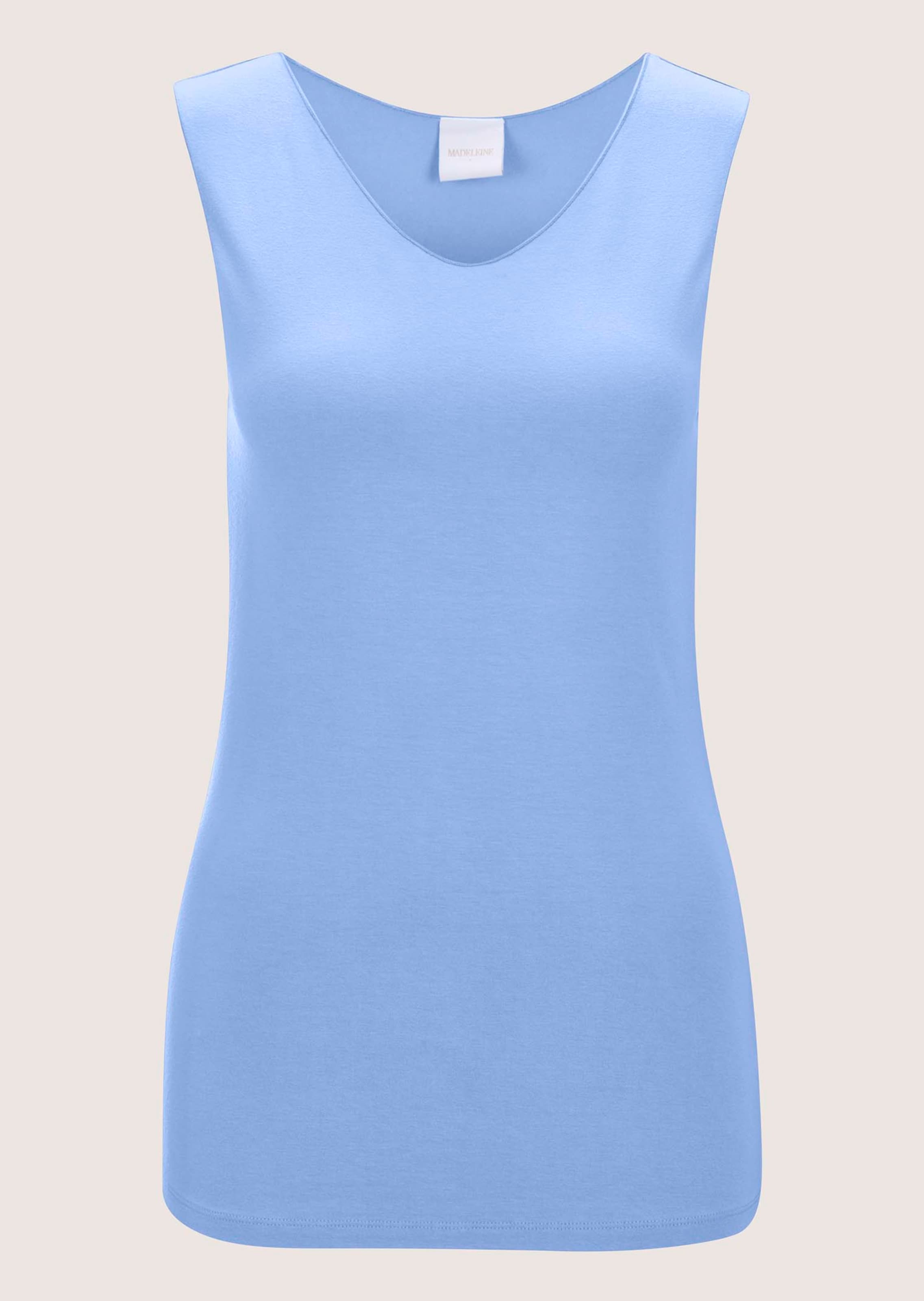 Ein Sommer-Shirt, das vielseitig kombiniert werden kann und in keiner Garderobe fehlen sollte. Hautschmeichelnder Viskose-Stretch ist weich fliessend und angenehm kühl auf der Haut. Die softe Qualität macht jede Bewegung mit und zeigt sich hier in leicht taillierter, ärmelloser Kurzform. Rundhalsausschnitt und breite Träger werden von einer edlen Overlock-Kante akzentuiert. Eine gerade Saumkante rundet den Look unaufgeregt ab.