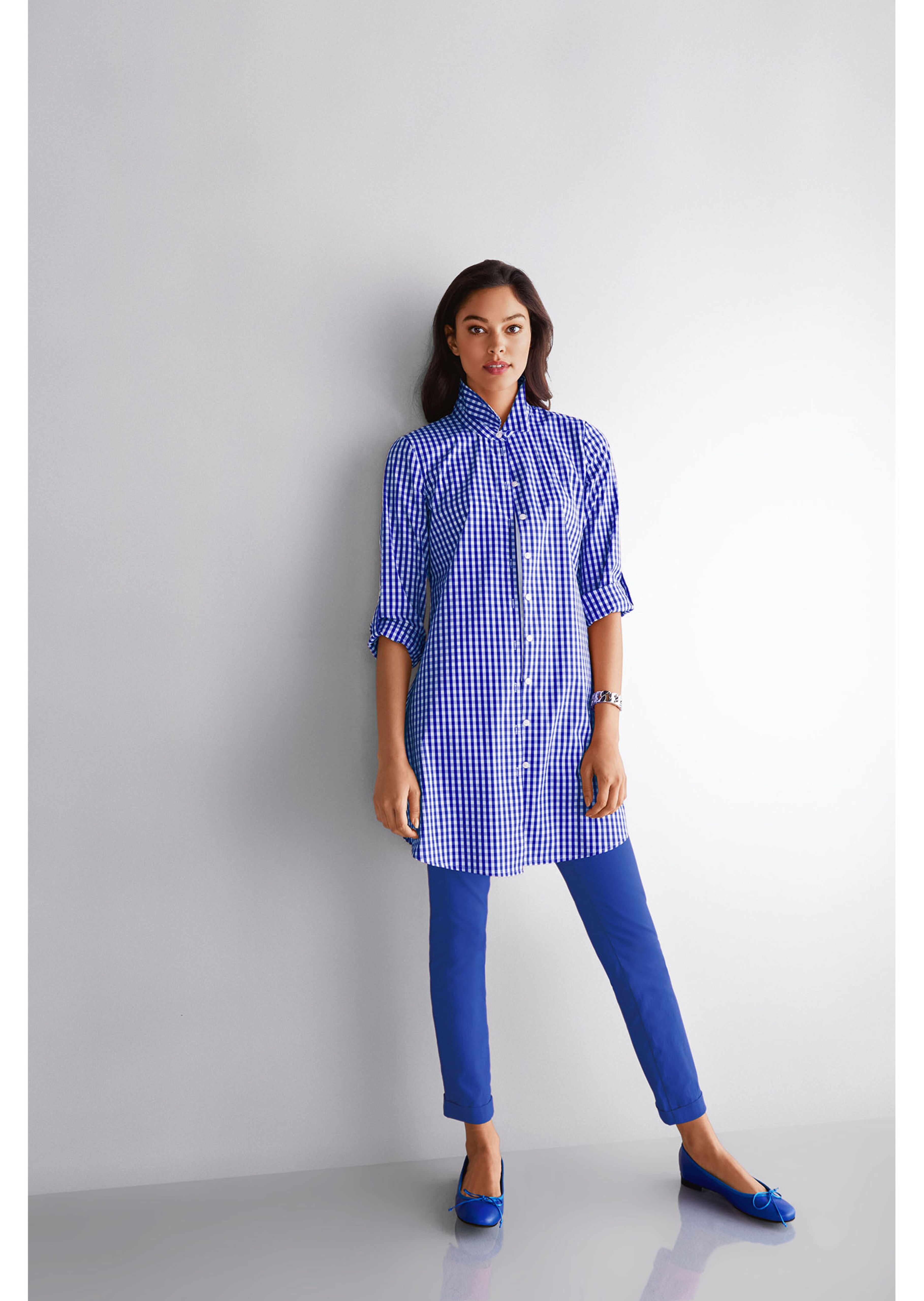 Der Musterklassiker Vichy-Karo gehört auch diesen Mode-Sommer unbedingt dazu. Garngewebt und in typischer Zweifarbigkeit macht es das Blusenhemd zu einem Keypiece lässiger Casual-Looks. Die neue Longvariante ist superlässig – leicht tailliert und zum Saum hin ausgestellt umspielt sie besonders vorteilhaft die Figur. Die durchgehende Knopfleiste, der Hemdkragen und der gerundete Saum mit Seitenschlitzen sind stiltypische Details. Der lange Ärmel mit Knopf-Manschette lässt sich krempeln und per Riegel und Knopf fixieren. Durch die elastische Baumwollmischung trägt sich das Longhemd herrlich komfortabel. Perfekte Stylingpartner: Slimline-Hosen!