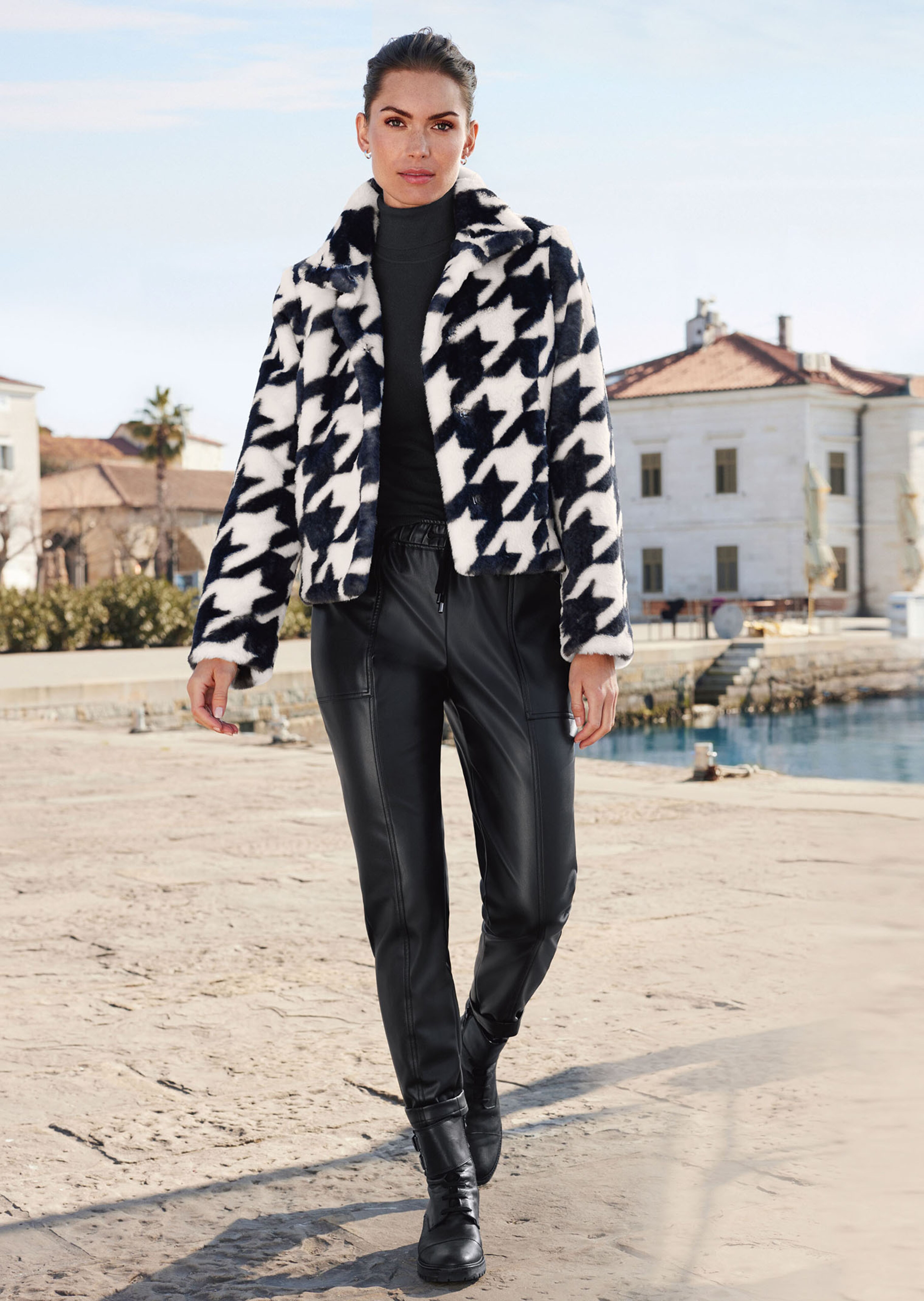 Eine Jacke mit Wow-Effekt und ein echtes Fashion-Highlight. Kuschelig weicher Webpelz und grossflächiges Hahnentritt-Dessin machen das Tragen zum puren Genuss und lassen sie zum echten Hingucker werden. Die stylische Kurzjacke ist vielseitig kombinierbar und mit Druckknöpfen zu schliessen. Stehkragen, lange Ärmel und Taschen runden den Look ab. Ein Kettenaufhänger gibt Halt an der Garderobe.