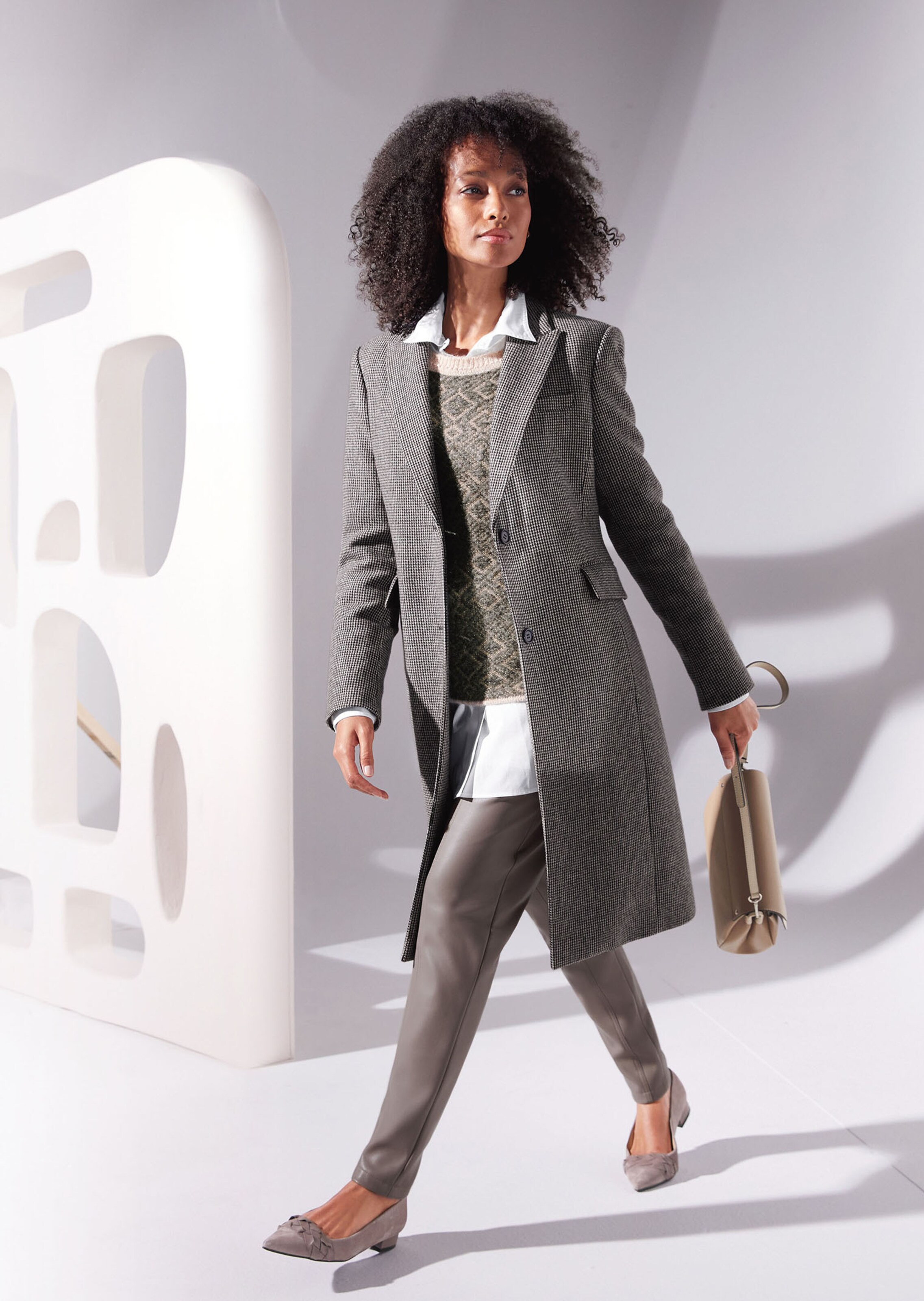 Lederimitat ist sehr gefragt und im Gegensatz zur Natur-Qualität besonders leicht zu pflegen. Die beschichtete Hose ist schlank im Look und mit modischen Teilungsnähten gearbeitet. Aufgesetzte Schubtaschen schaffen Stauraum und werden von rückseitigen Zierleisten ergänzt. Der Elastikbund wird von einem Durchzug mit Metall-Ösen in Szene gesetzt und ist bequem zum Schlüpfen.