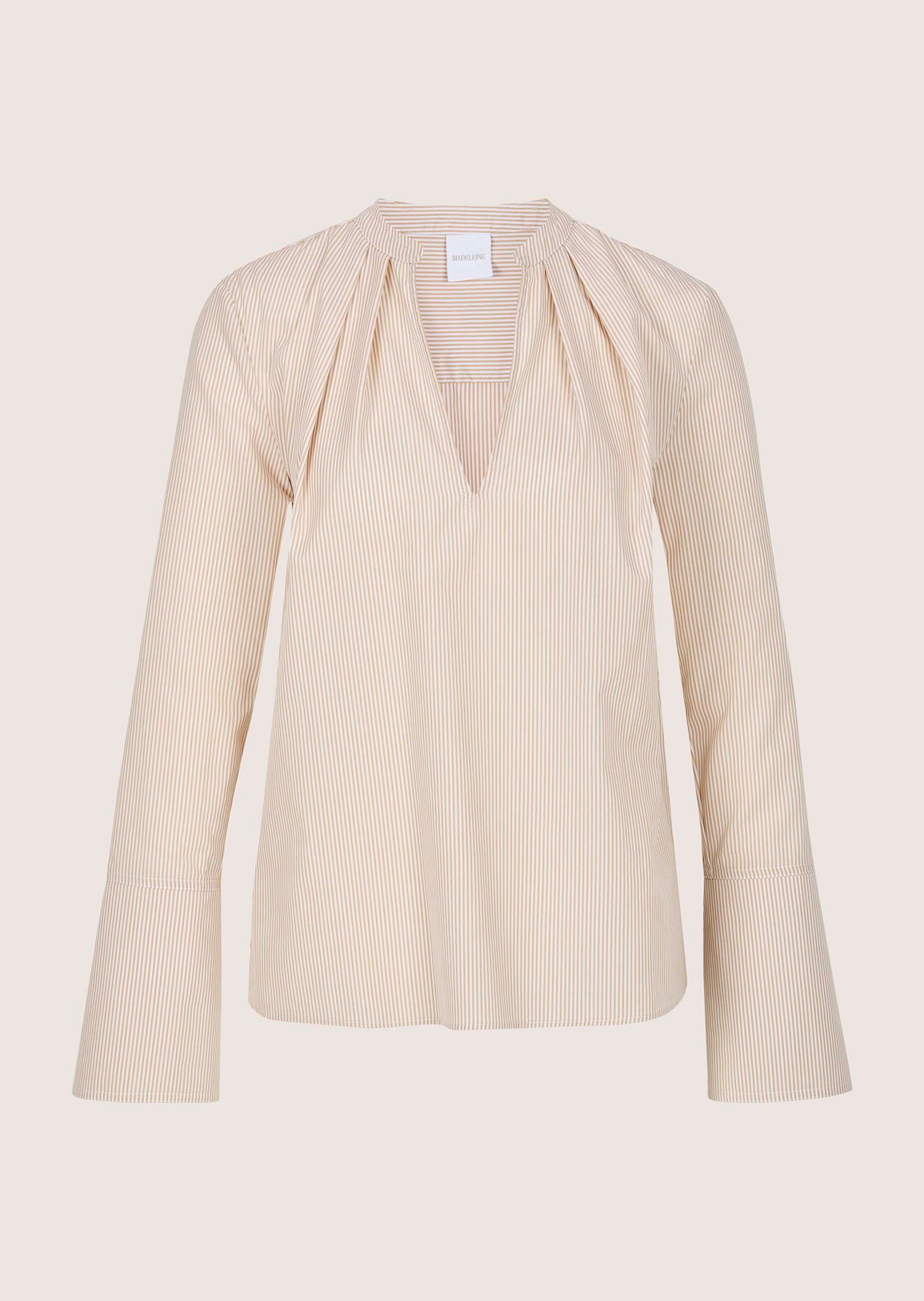 Detailverliebt und sommerlich zeigt sich diese Baumwollbluse mit feinen Streifen und einer Rundhalsblende, die in einen charmanten V-Ausschnitt übergeht, der von gelegten Falten eingefasst wird. Die langen Ärmel enden in auffallend breiten Manschetten, die sich mit einem Bindeband schliessen lassen und ein verspieltes Detail setzen. Eine Rückenpasse und der gerade Saum mit Seitenschlitzen unterstreichen den figurumspielenden Schnitt.