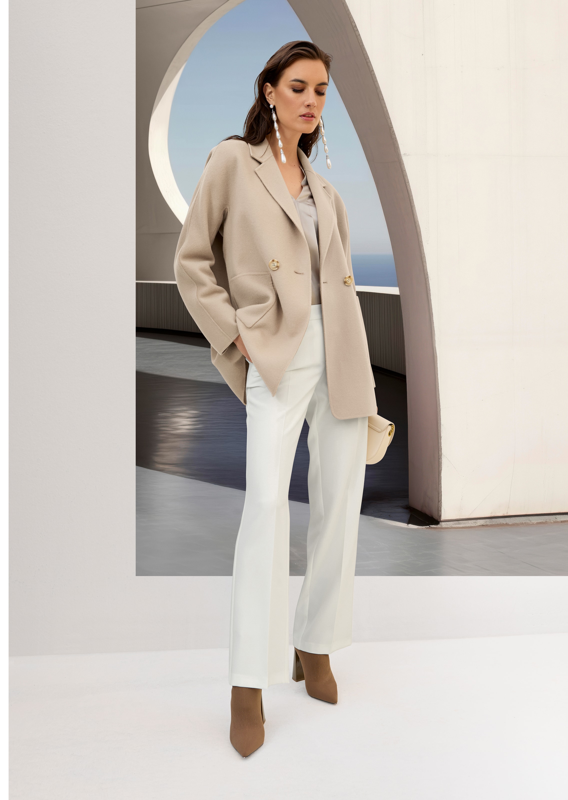 Ein zauberhaft inszenierter Zweireiher, der durch seine trendstarke Kurzform mit modischem Chic begeistert und vielseitig kombiniert werden kann. Feinstes Wolltuch präsentiert sich hier in zweilagiger Doubleface-Verarbeitung mit zwei farbidentischen Seiten. Angenehm leicht im Trage-Gefühl und leger geschnitten punktet der Mantel mit hohem Trage-Komfort und ist mit klassischem Reverskragen, langen Ärmeln und grossen, aufgesetzten Taschen ausgestattet. Dekorative Ziernähte runden den Look liebevoll ab.