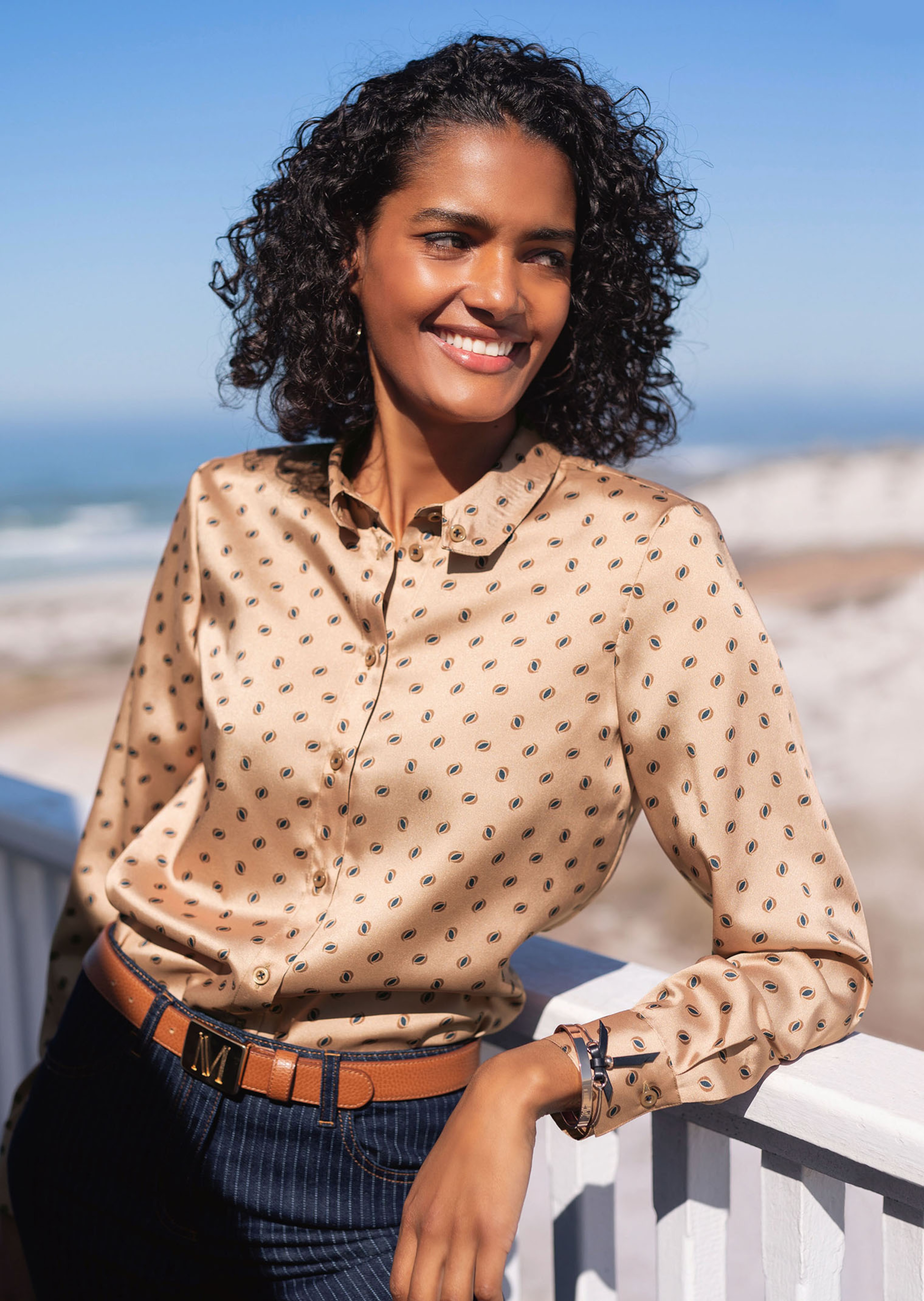 Setzen Sie ein Stil-Statement! Die elegante Bluse mit stilvollem Print transportiert souveräne Klasse. Ihr Print macht aus jedem Stück ein Unikat! Den modernen Style haben wir für einen zeitlosen Look mit variablem, knöpfbarem Hemdkragen, Schulterpolstern, langen Ärmeln, Knopfmanschetten und leicht gerundetem Saum gestaltet – so können Sie die Hemdbluse auch ausserhalb des Bundes tragen. Die kofferfreundliche Qualität ist pflegeleicht, dadurch bietet sich die Bluse auch perfekt für die Reise an.